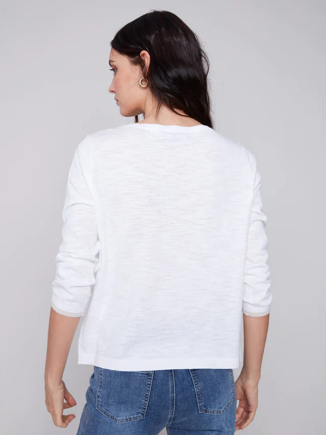 This whimsical sweater is going to instantly brighten your look and your mood. The ¾ sleeves, relaxed fit and lightweight cotton fabric make it a perfect spring and summer sweater!