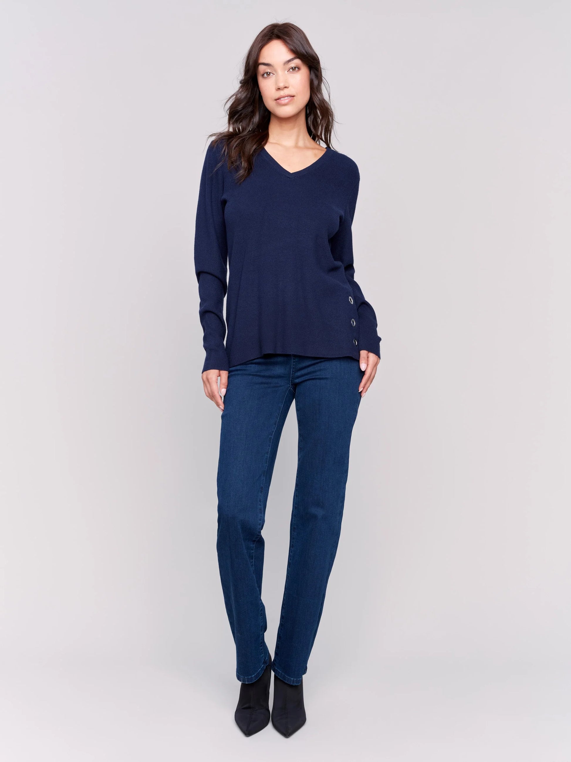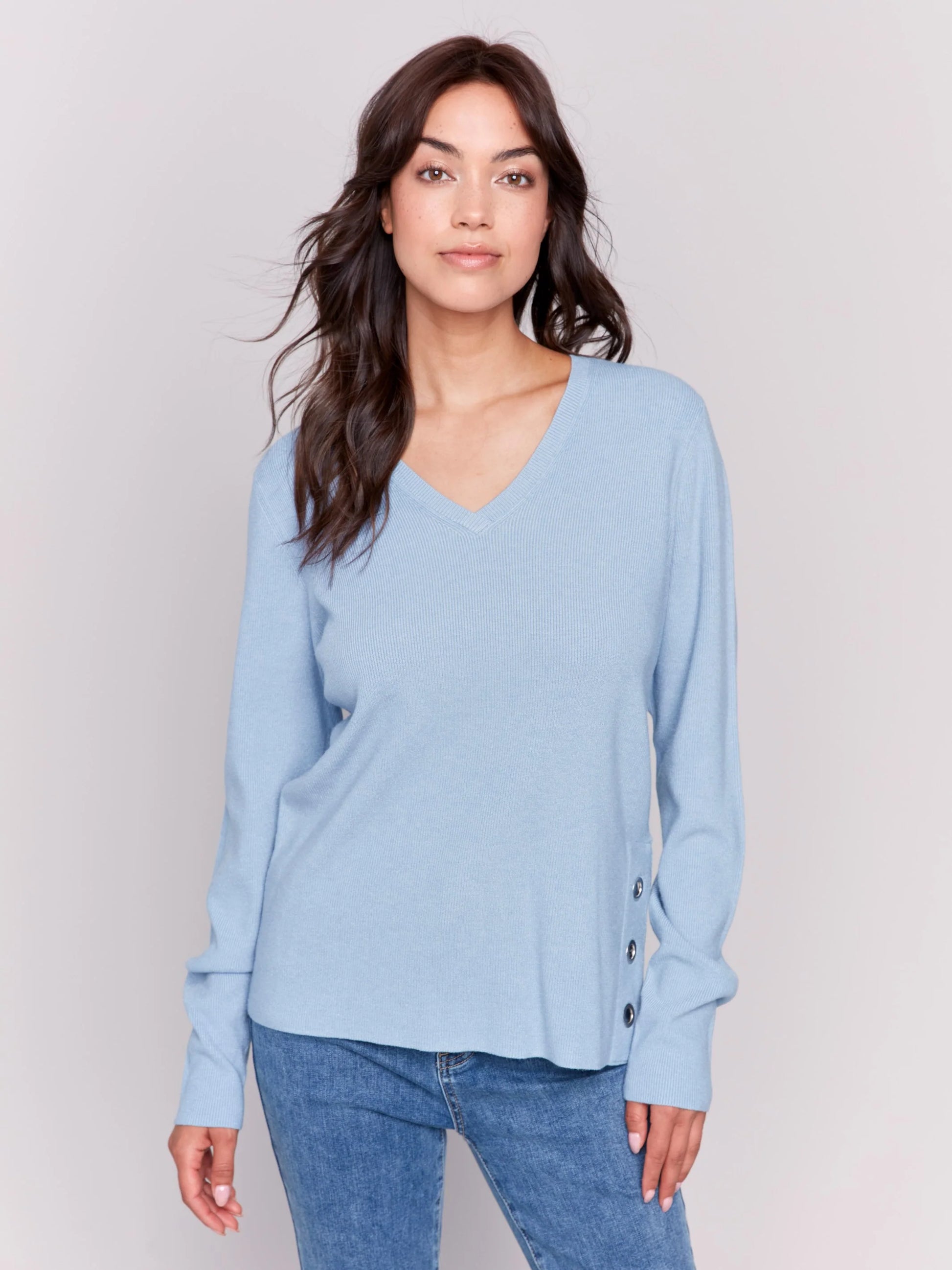 Experience the perfect blend of elegance and comfort with our plushy knit V-neck sweater. The unique grommet details along the side make it a standout piece. Perfect for any setting, whether you're at the office or enjoying a cozy night in. Elevate your wardrobe with this must-have versatile sweater.