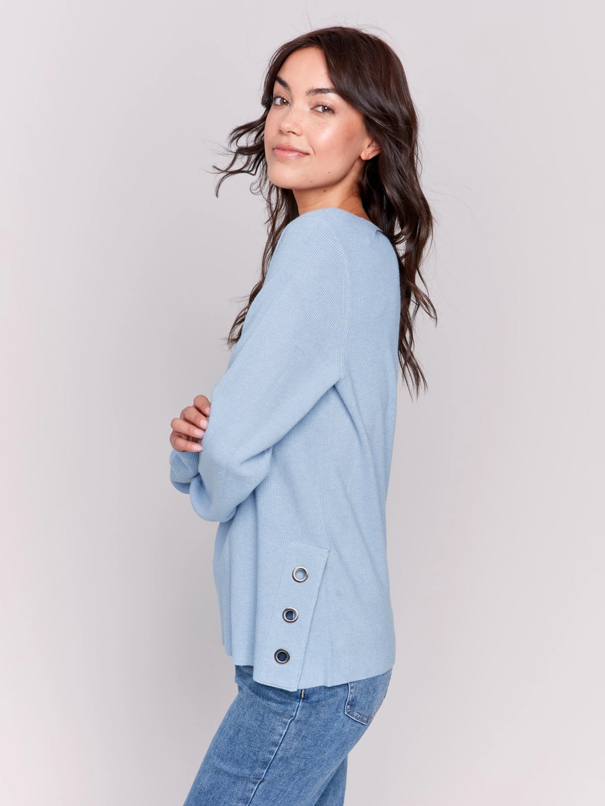 C.B C2569R V-Neck Sweater with Grommet Detail
