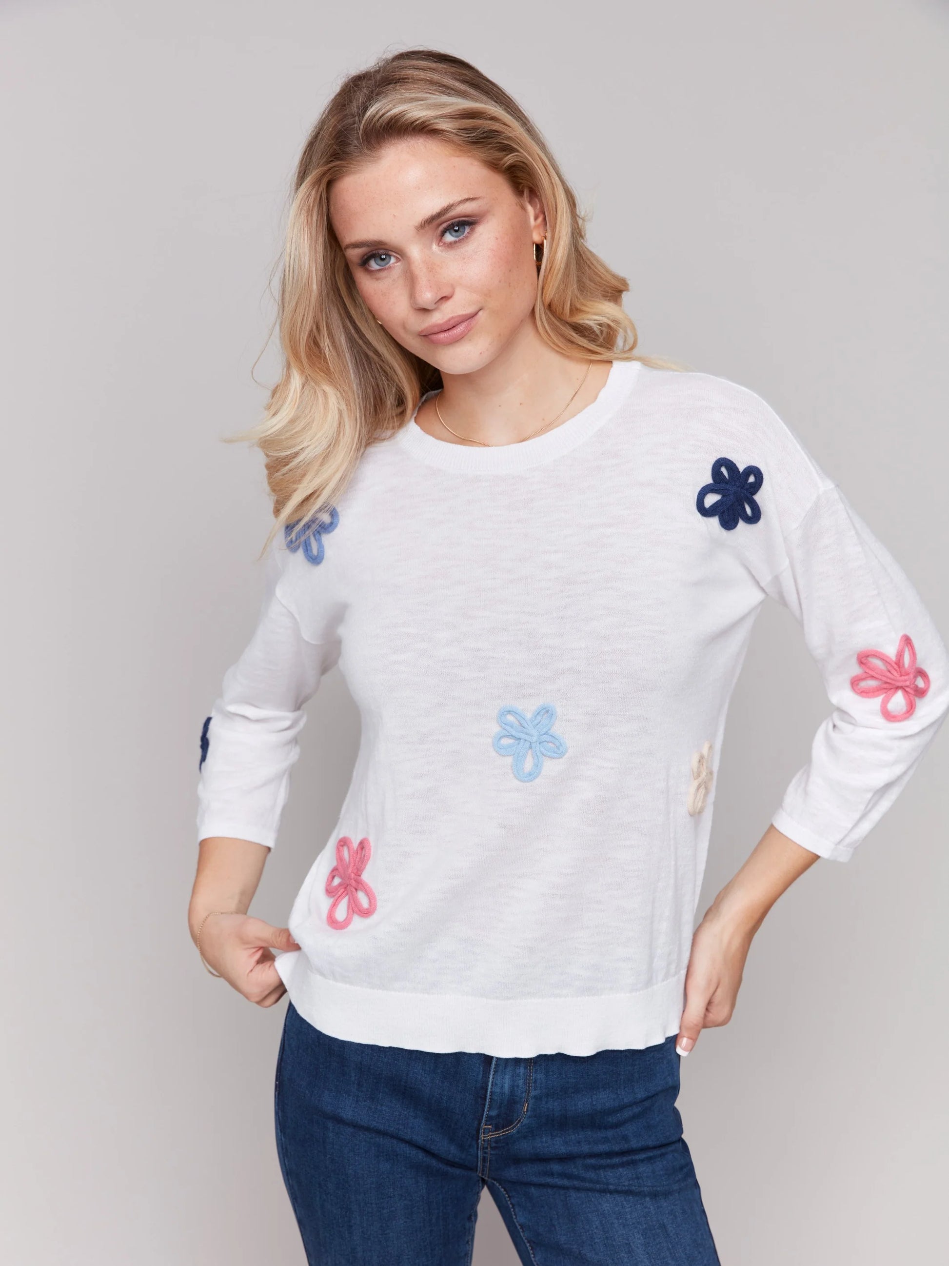 C.B C2643R Cotton Sweater with Flower Patches
