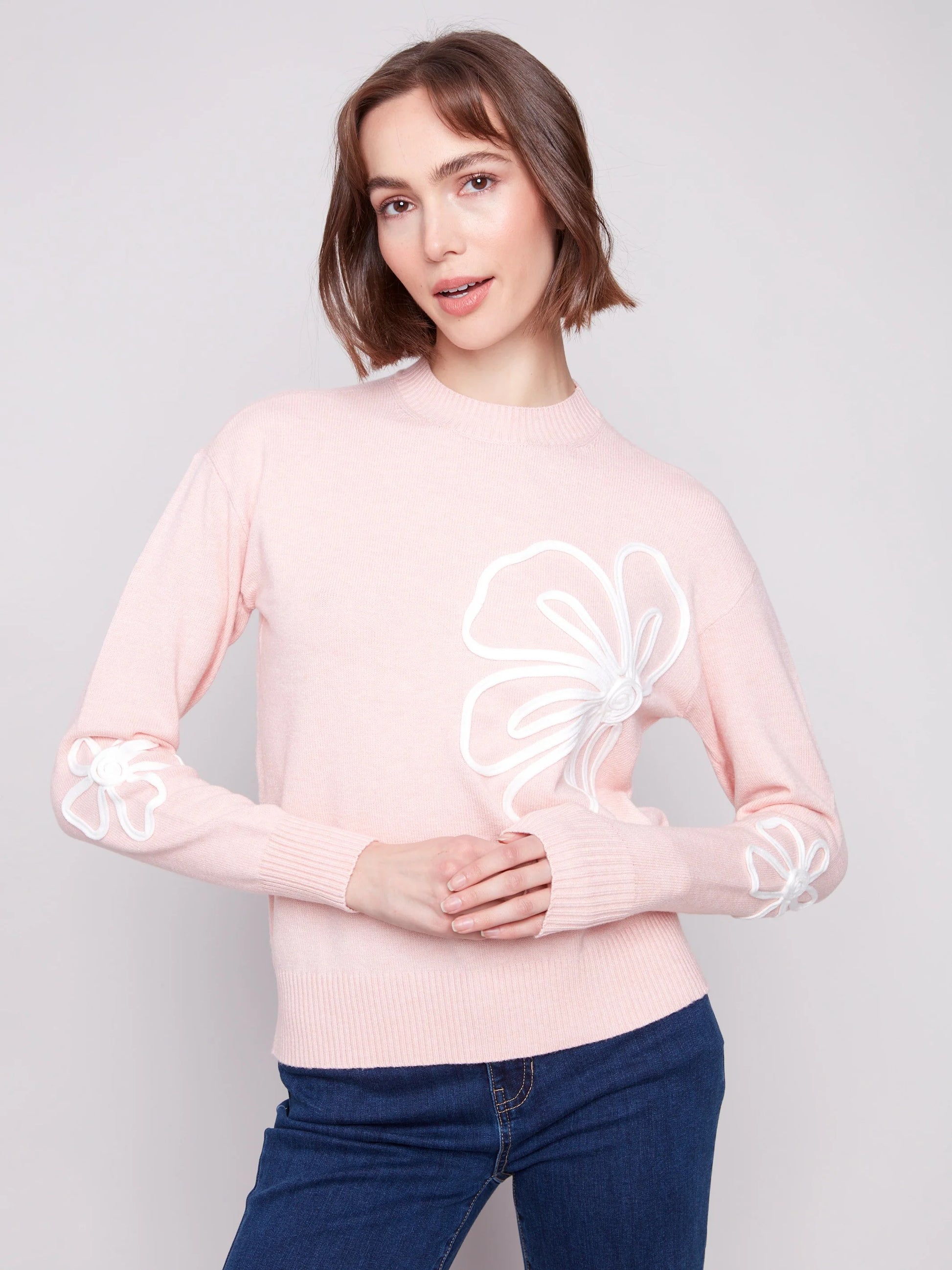 Enhance your fall wardrobe with this charming crew neck sweater. In a soft Heather Ballet pink hue, it features delicate floral soutache detailing for a sophisticated fall look. Perfect for everything from casual outings to weekend brunches, it delivers versatile style with comfort and chic appeal.