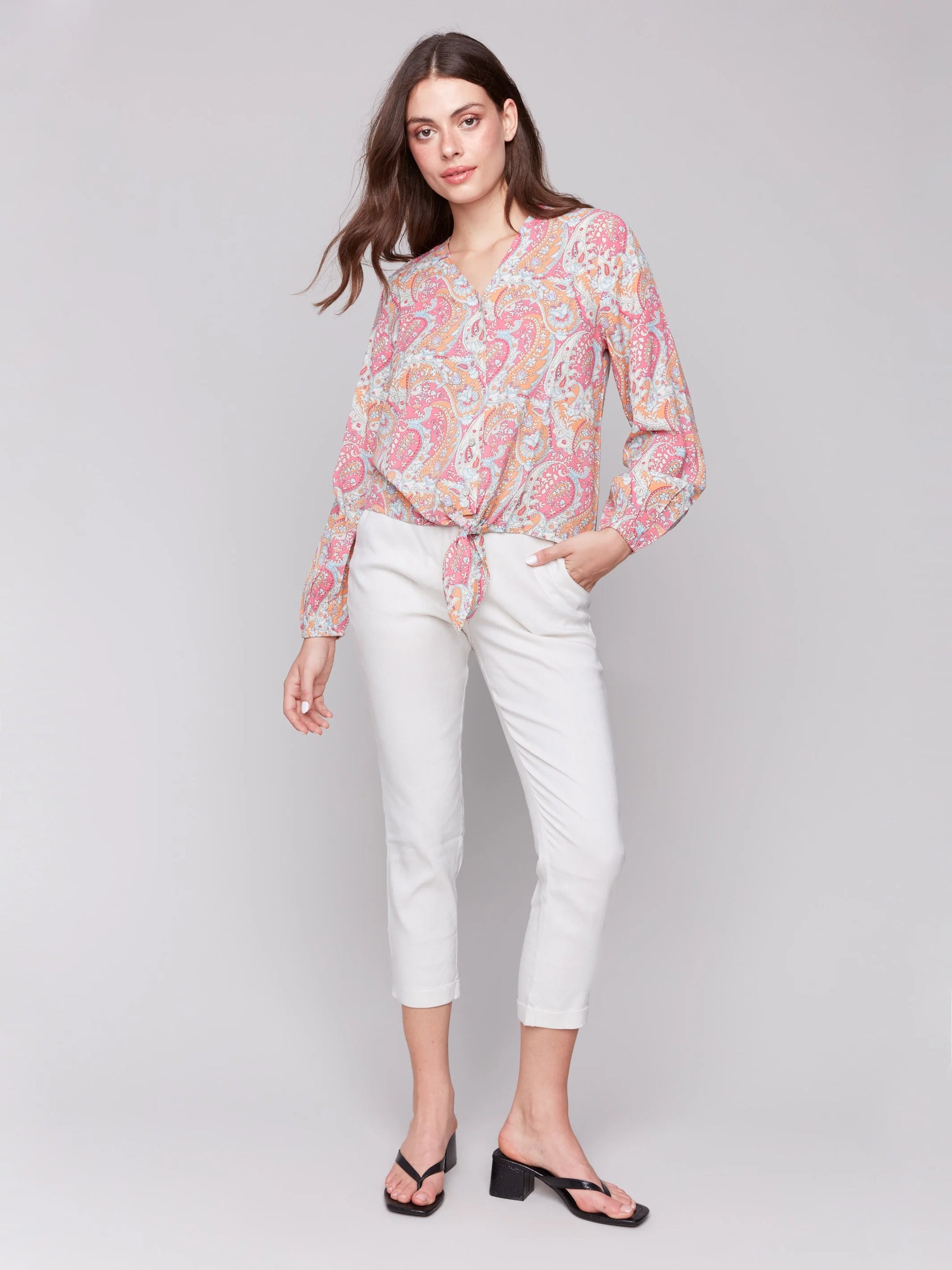 Step up your style with this captivating colorful paisley blouse, a spring-summer wardrobe essential you won’t be able to resist. Featuring graceful long sleeves and a stylish front tie detail, it’s a statement piece you’ll love throughout the seasons. Beautifully designed to embody elegance and sophistication, it’s perfect for any event. Make this timeless masterpiece yours today!