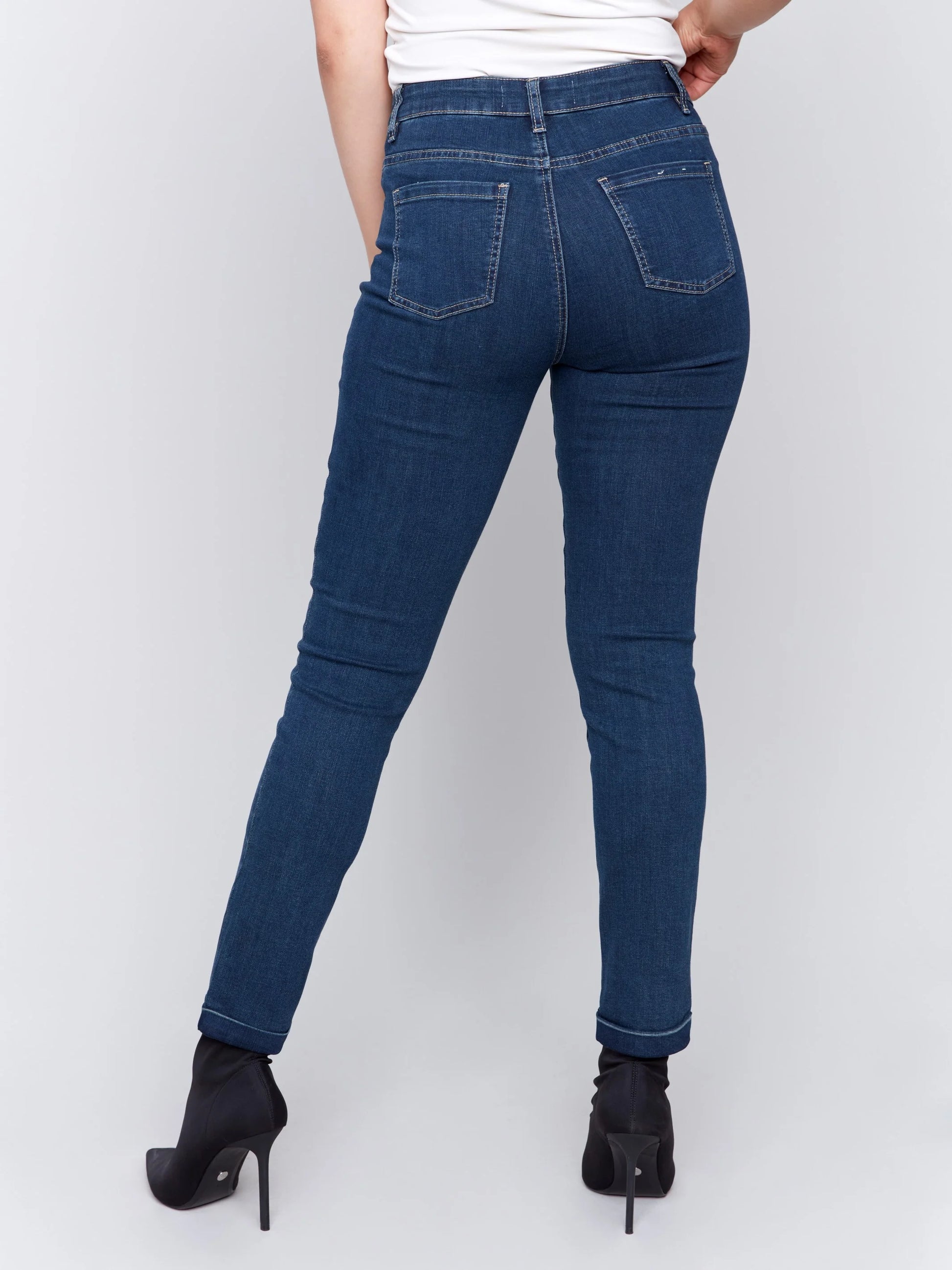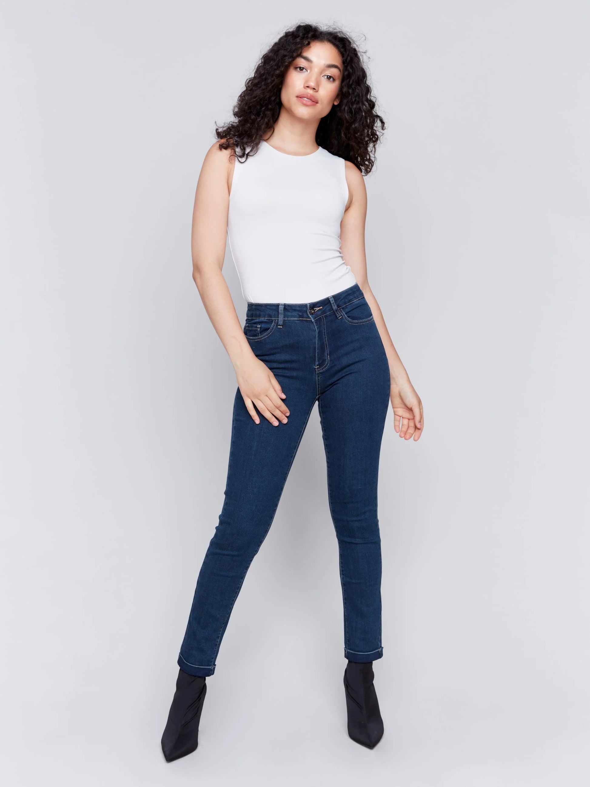 Step out in style with these perfect slim-leg, dark blue jeans. Mid-rise waist for ultimate comfort. The versatile cuffed hems give a unique touch to your outfit. Match them with your favorite top and shoes for a casual or dressed-up look this fall!
