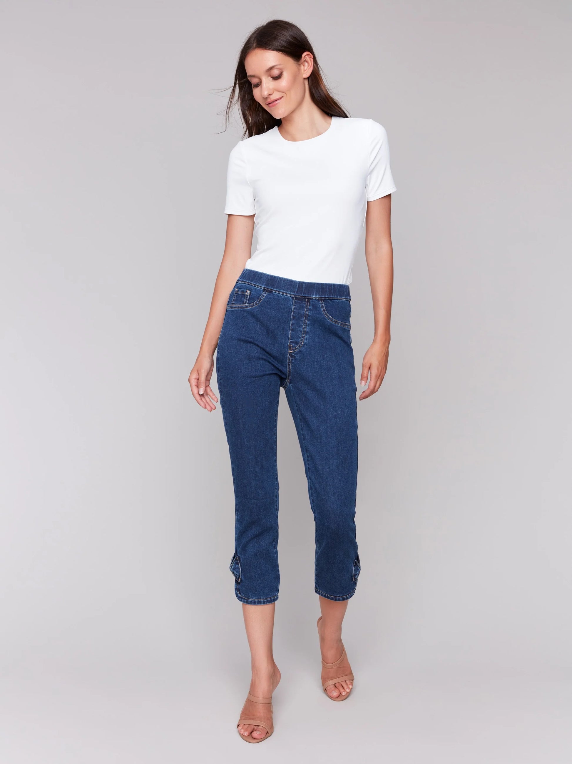 Walk out in style with these indigo blue pull-on jeans. With a slim leg and cute bow detail, they're ideal for any casual event this spring and summer. Enjoy the comfort and elegance of this must-have denim style.