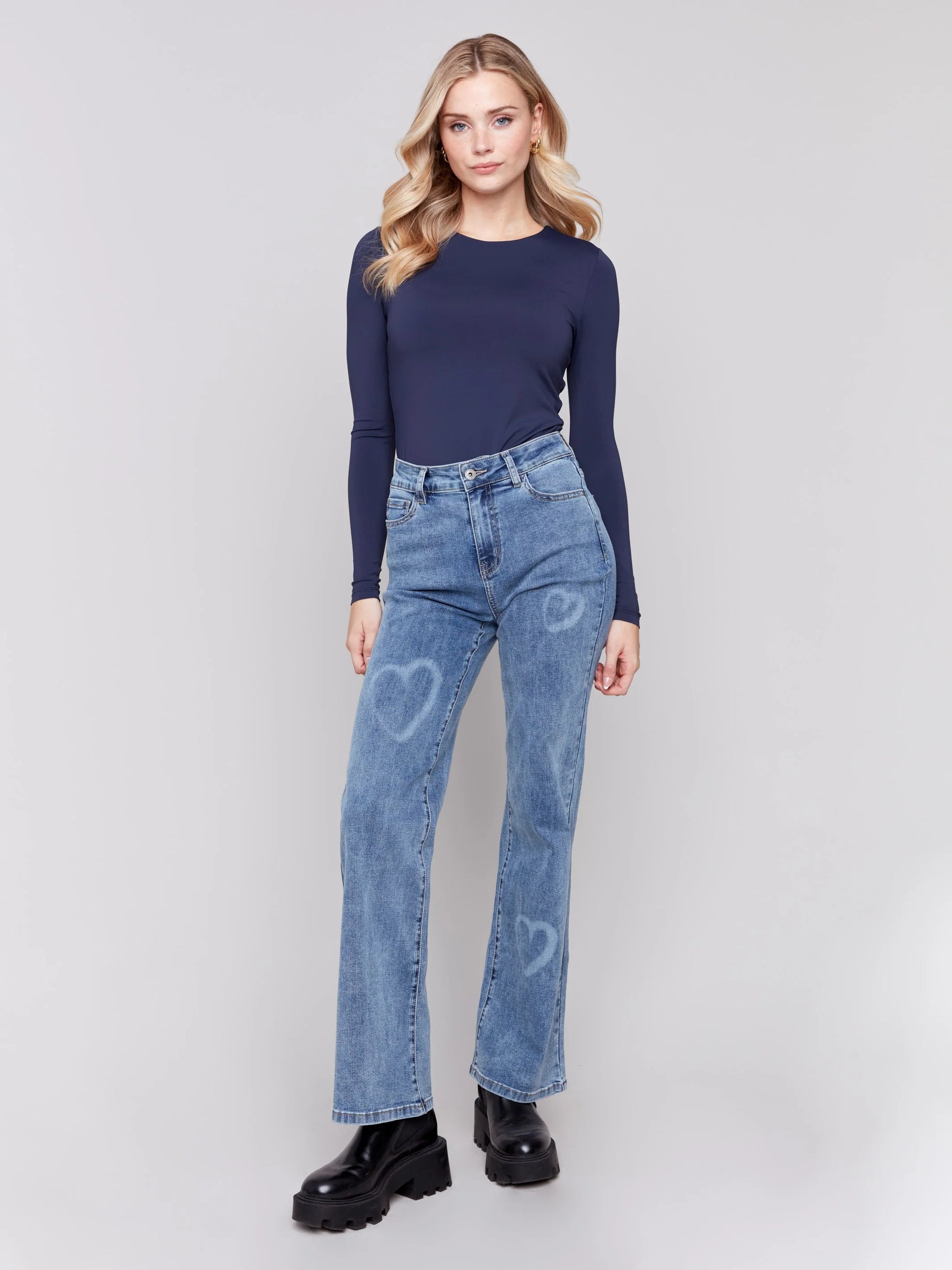 Show your playful side with these stylish flare jeans featuring a unique heart design. Crafted from high-quality denim, these jeans offer both comfort and durability. Their mid-rise waist and flattering flare leg make them a versatile addition to your fall wardrobe. Whether you're heading out for a casual day or dressing up for a night out, these blue jeans are sure to make a statement.