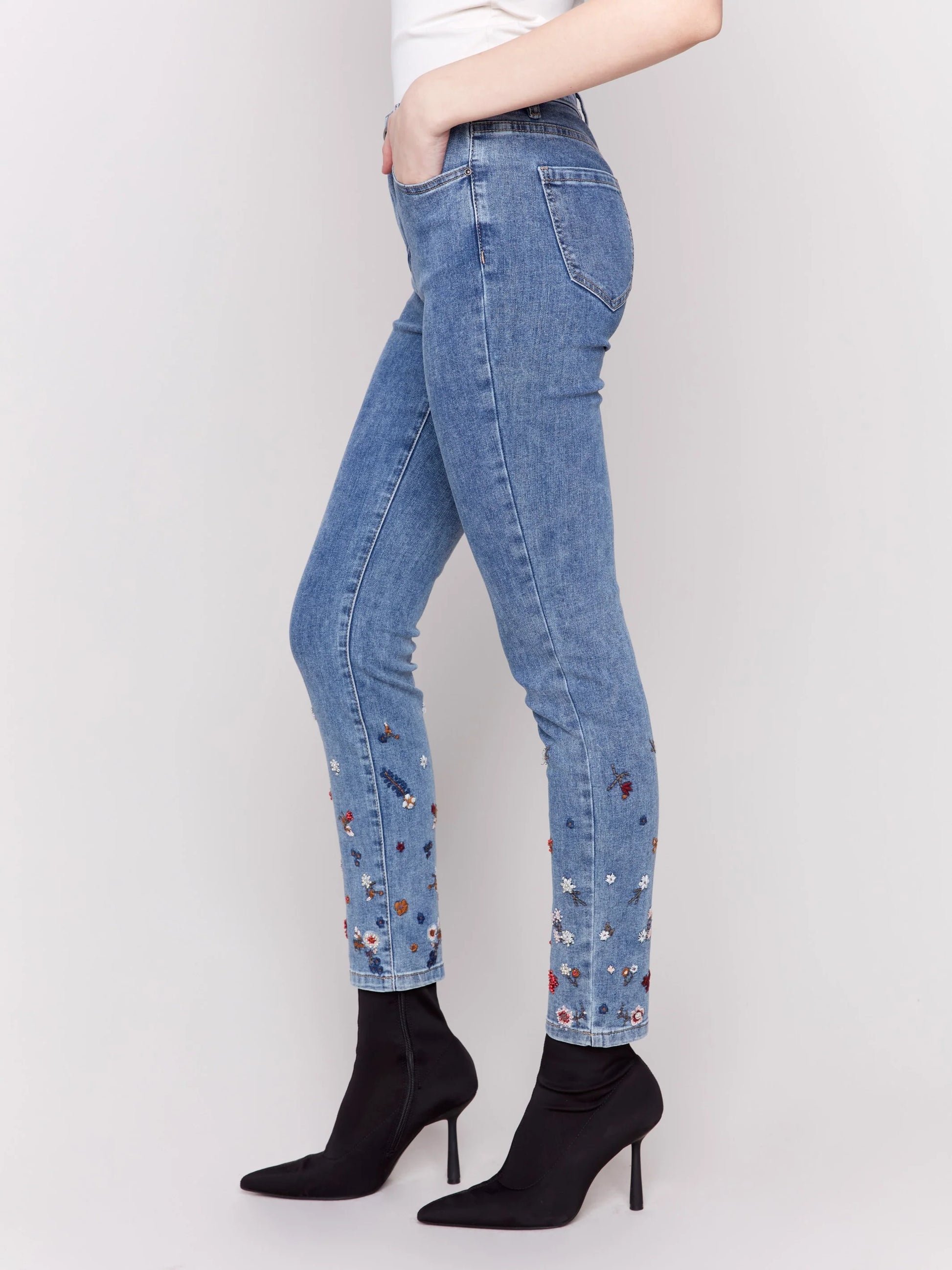 Embody the artistic essence flowing though these jeans. It's crafted to offer you a classic and timeless fit. The beautiful floral embroidery and beadwork add a captivating touch of personality and style. Their length makes them perfect for effortless pairing with any shoes. This ensemble ensures you exude confidence and style wherever you go.