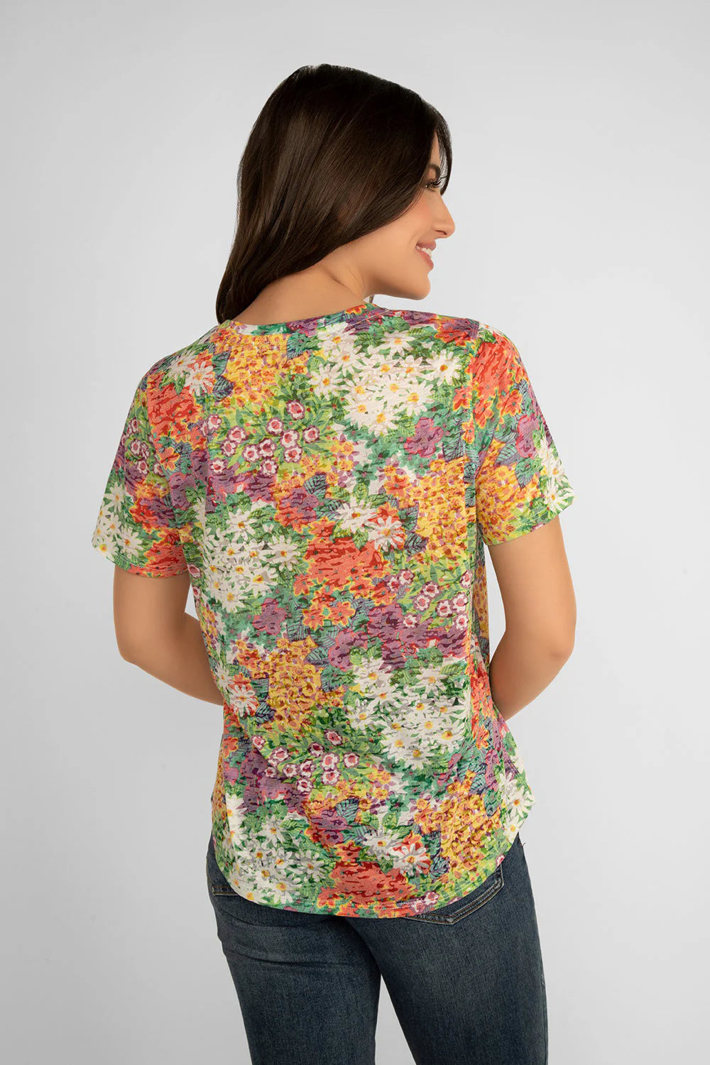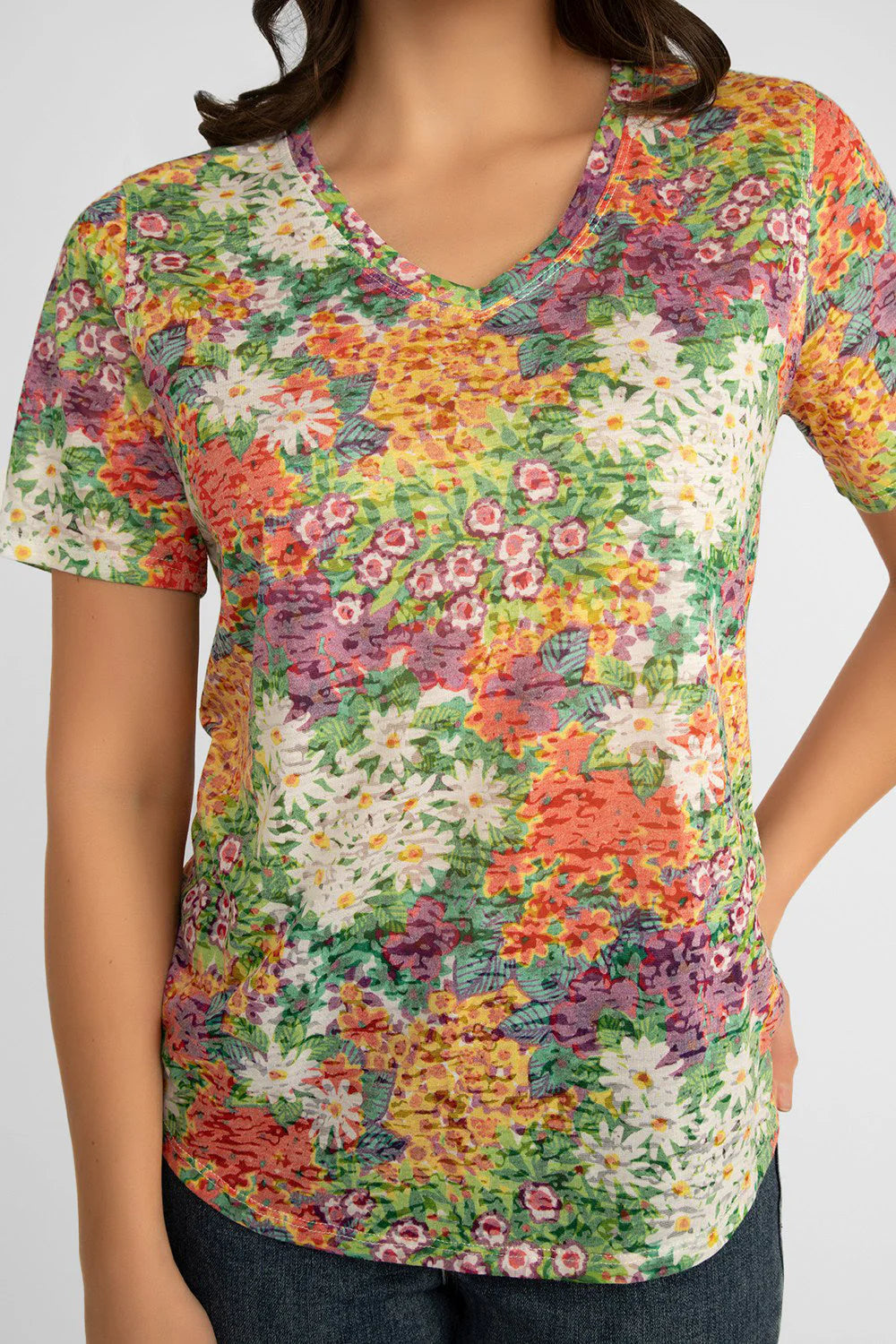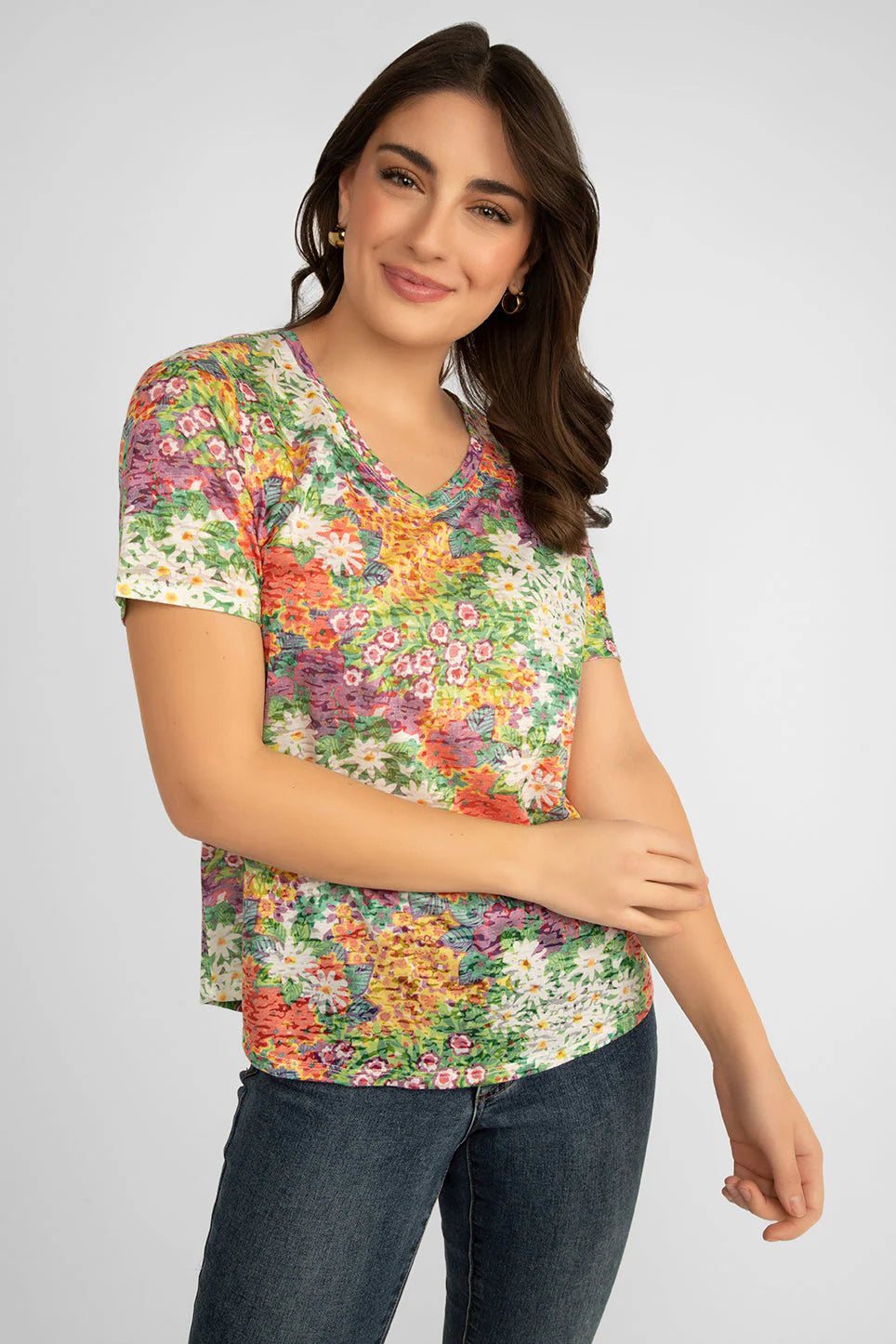 Fabulous florals aren't just for fancy dresses. This classic V-neck tee from Carre Noir is a perfect for adding the spirit of a summer to your everyday look. With a blend of colours it can easily be styled with a number of bottoms from jeans to khaki to mix up your casual style.