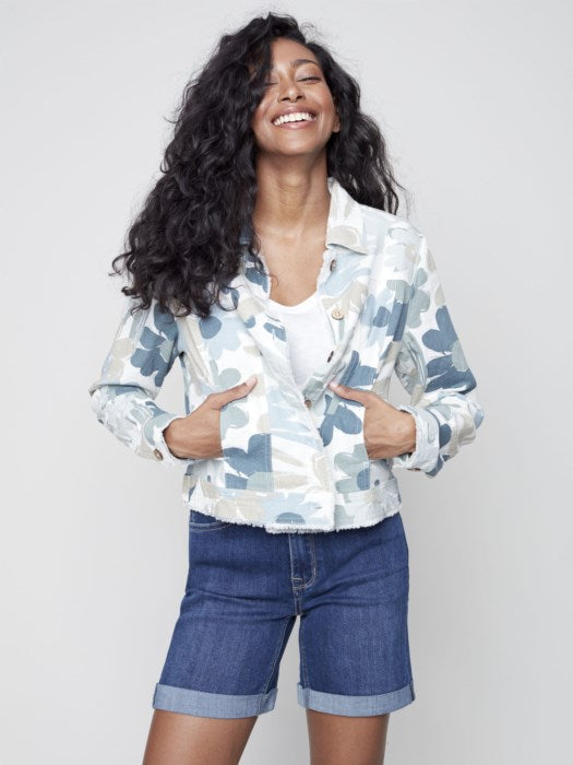 Printed Linen Jean Jacket Style With Frayed Edges Details