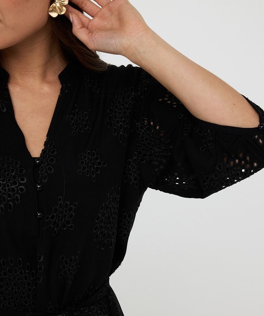 This black eyelet shirt dress brings timeless charm with a modern twist. Featuring delicate embroidered cutouts throughout, it offers breathable comfort while making a chic statement. The relaxed silhouette is cinched with a self-tie belt to flatter the waist, while the elbow-length sleeves and button-up neckline add a polished touch. Whether you're heading to brunch or a summer soirée, this dress is the perfect blend of sophisticated and casual.