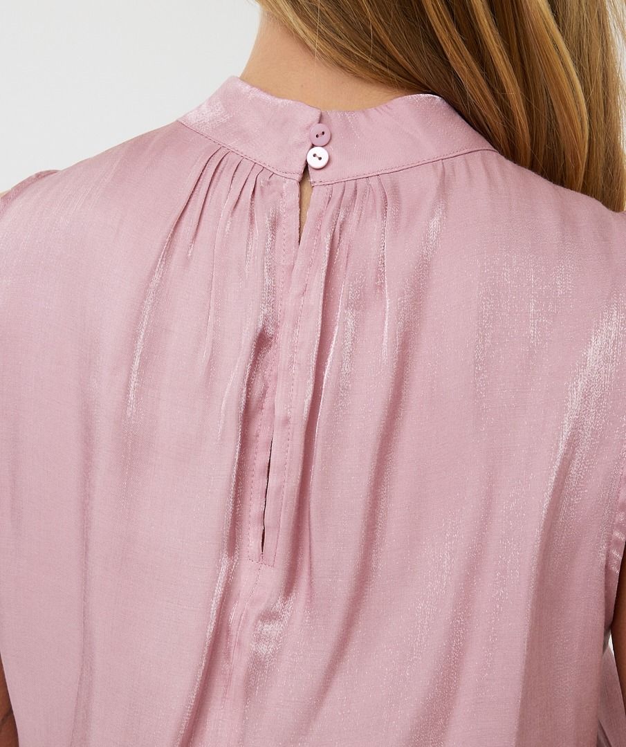 Chic shiny halter top with pleated detail at front neckline and button closure at back. Create an elegant look by combining the top with high waisted bottoms or a skirt, or pair it with a cute pair of shorts for a nice easy look!