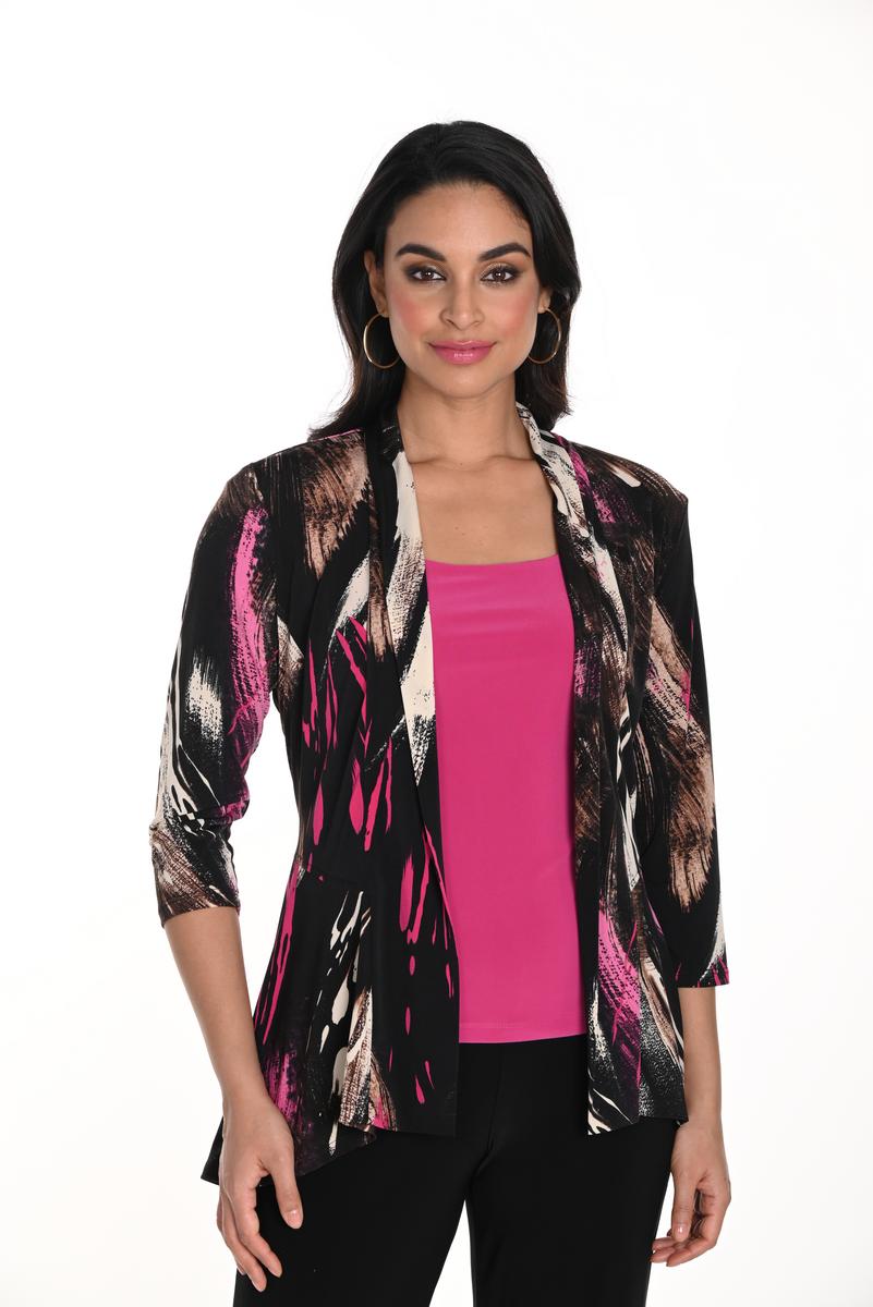 The delicate folded neckband, three-quarter sleeves, and flared hem of the Frank Lyman cover-up blazer give this luxurious layering piece a certain charm whilst the bold brushstroke print adds a vibrant and contemporary touch. Finished with an edge-to-edge design, on a silky knit stretch fabric and 3/4 length sleeves.