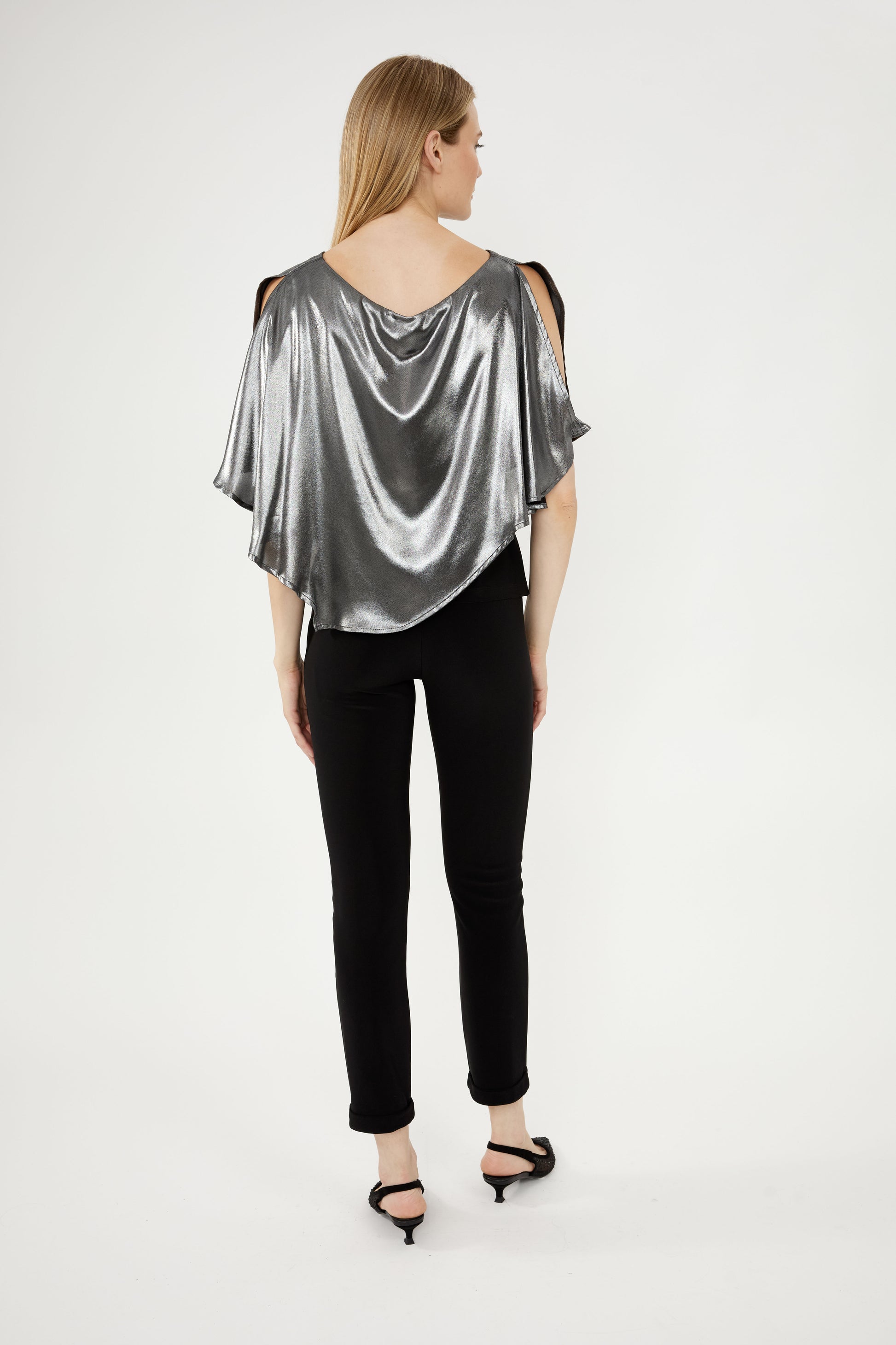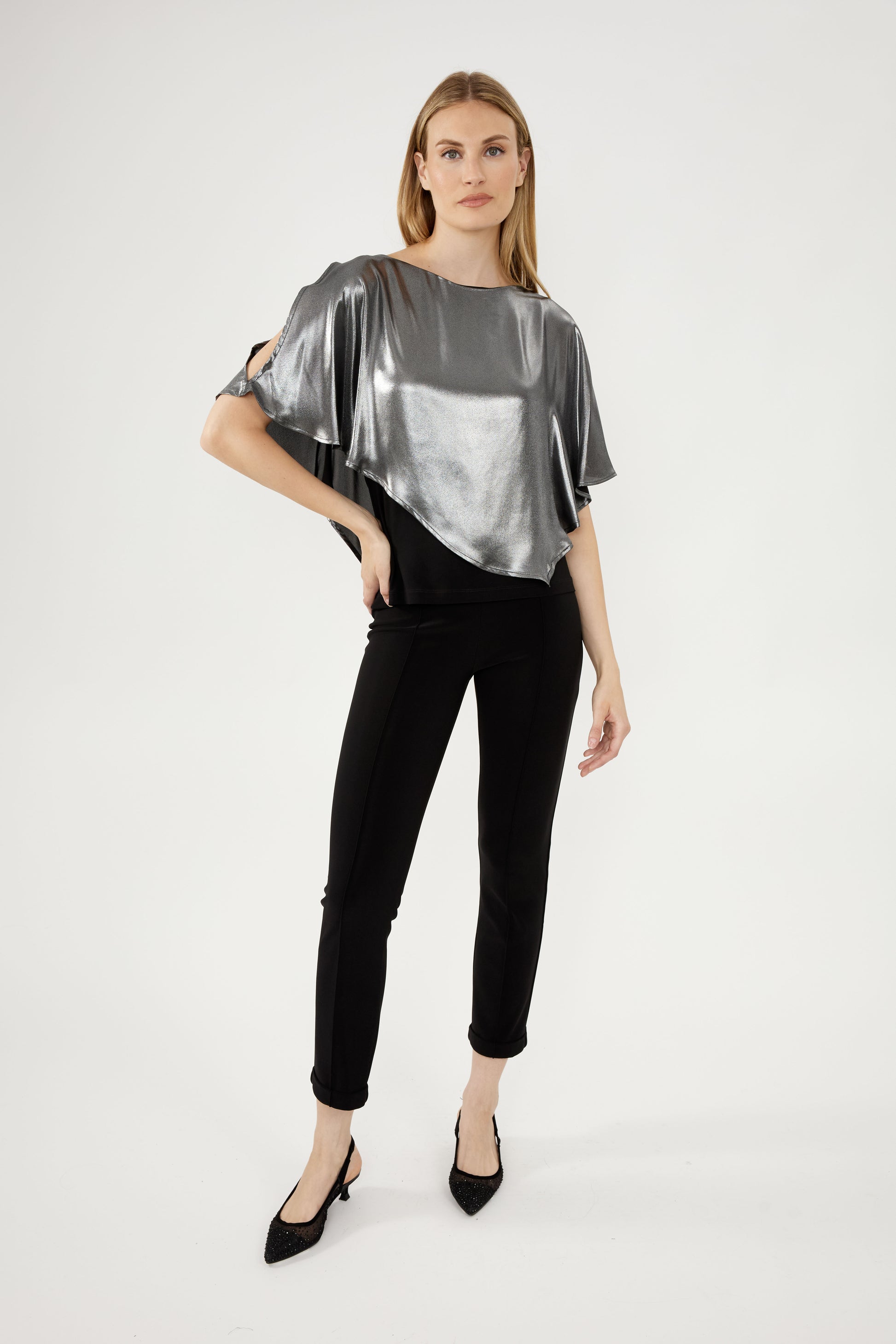 Discover the ultimate in sophisticated style with this glamorous Frank Lyman piece. The pullover design offers effortless wear, while the loose fit and hip-length cut provide comfort and versatility. Featuring a crew neck and flutter short sleeves, this plain metallic top is perfect for night-outs and semi-formal occasions. Embrace the chic and elegant look that sets you apart.