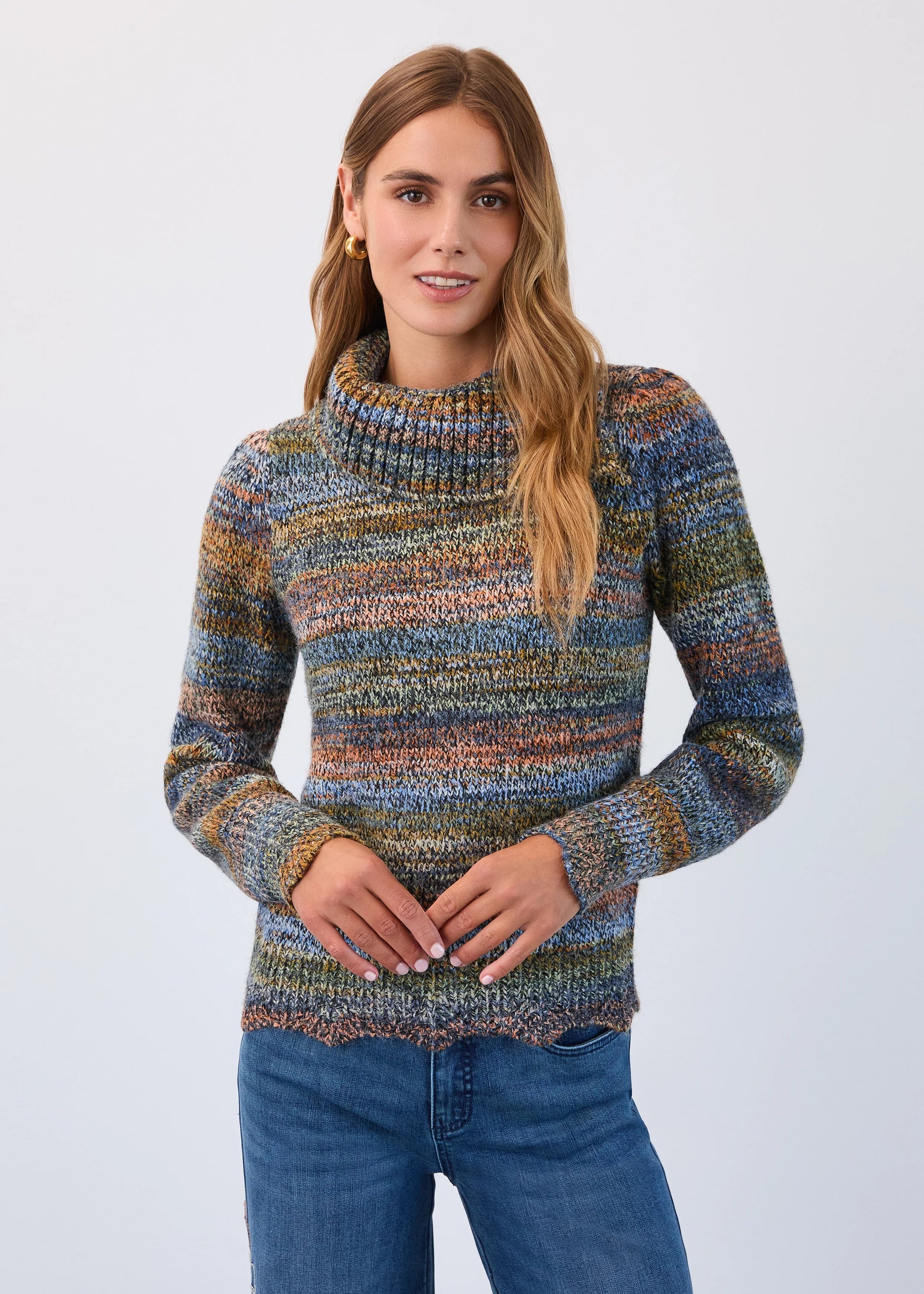 Knit with character. From the tonal shifts of its space-dye blend to the graceful envelope collar and scalloped edges, this sweater blends texture, femininity, and form into one uniquely polished piece.