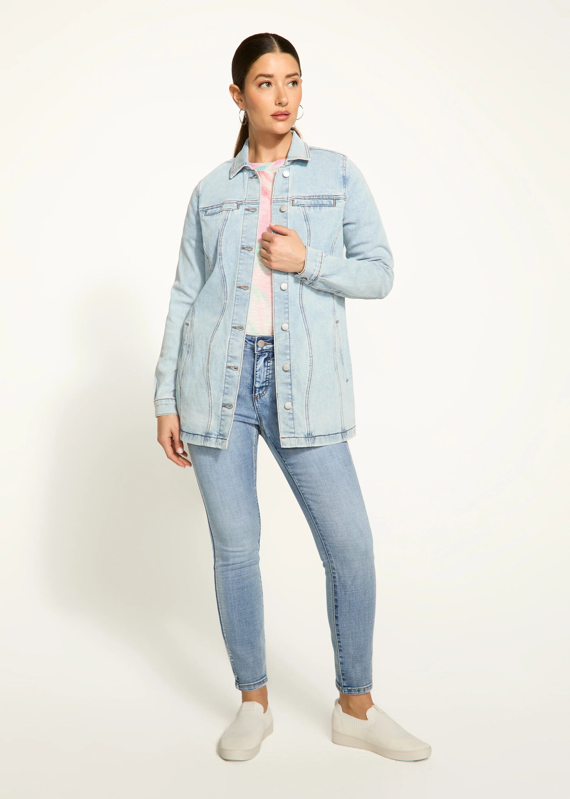 Effortlessly chic, this long denim jacket pairs perfectly with leggings and can be worn buttoned or open for versatile style.