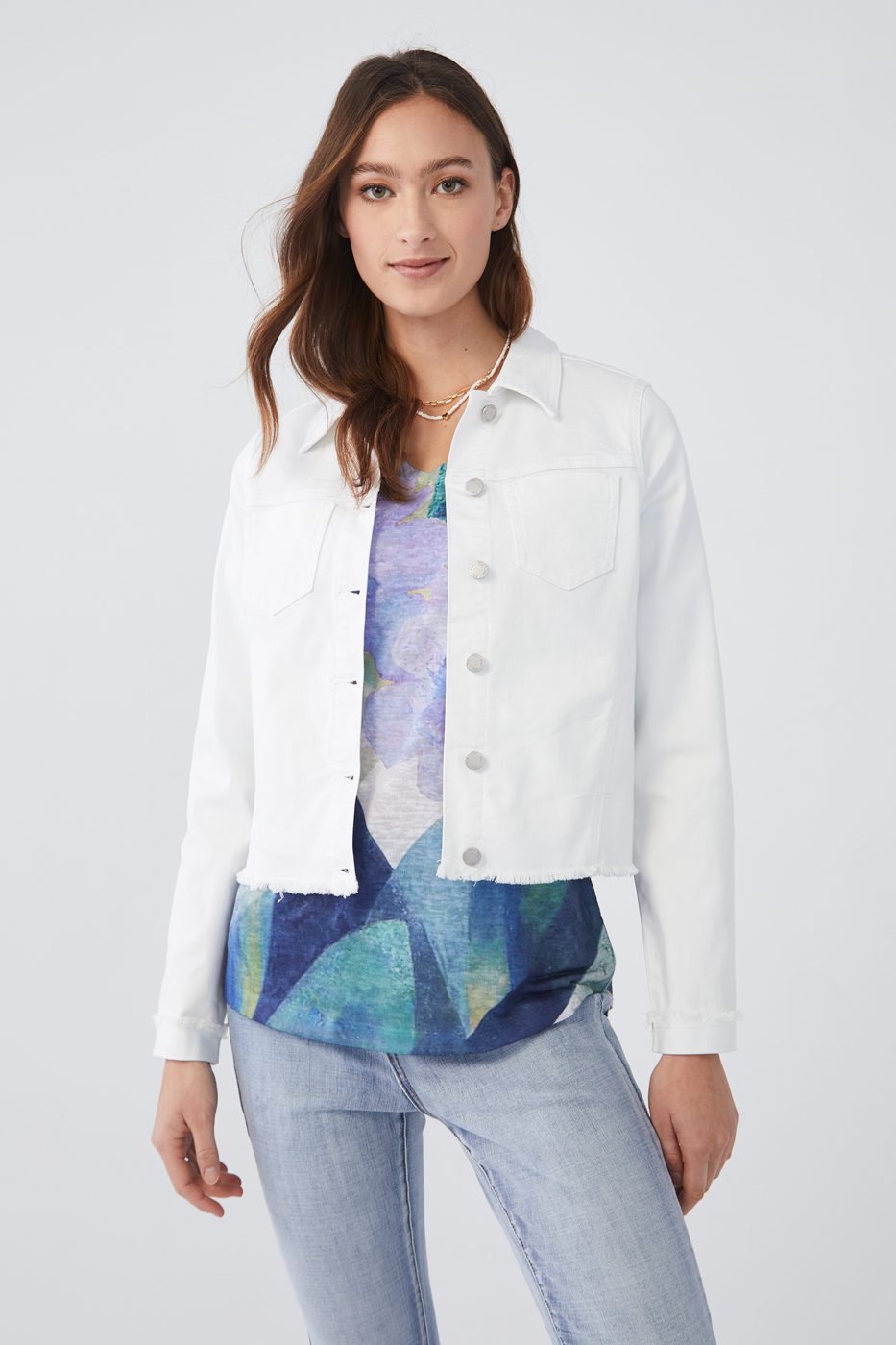 Need a pop of color this summer? This shirt jacket with frayed hem is the perfect add-on to your wardrobe. Style it with a shirt inside or on its own, you will turn looks everywhere you go.