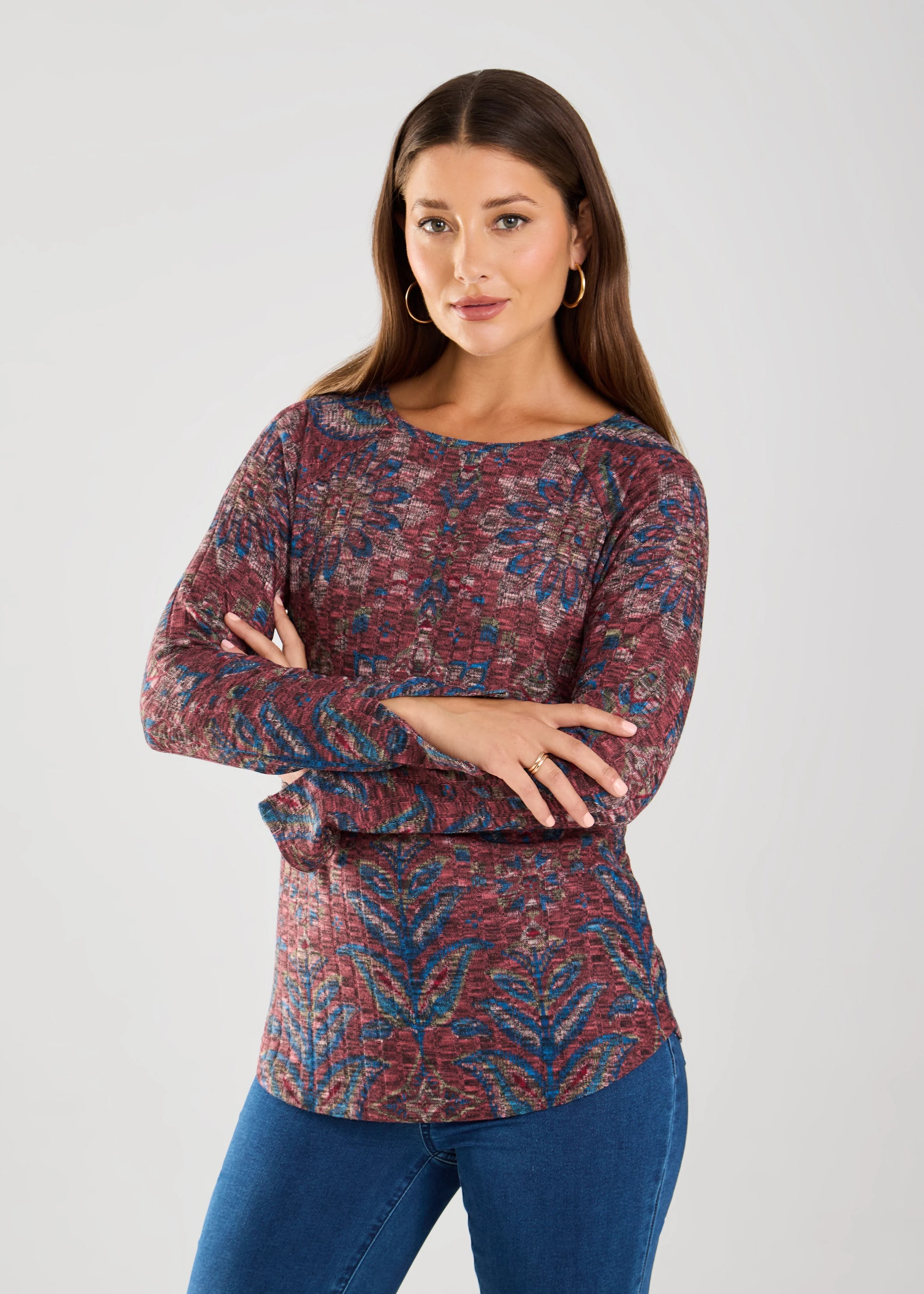 Featuring a local artist print, ribbed texture, and elegant side slits at the wrists, this top brings a touch of art and sophistication to your wardrobe.