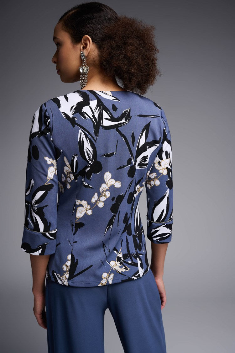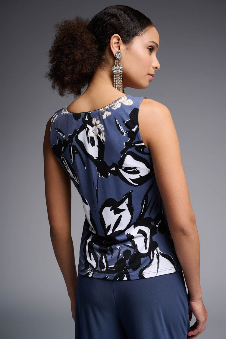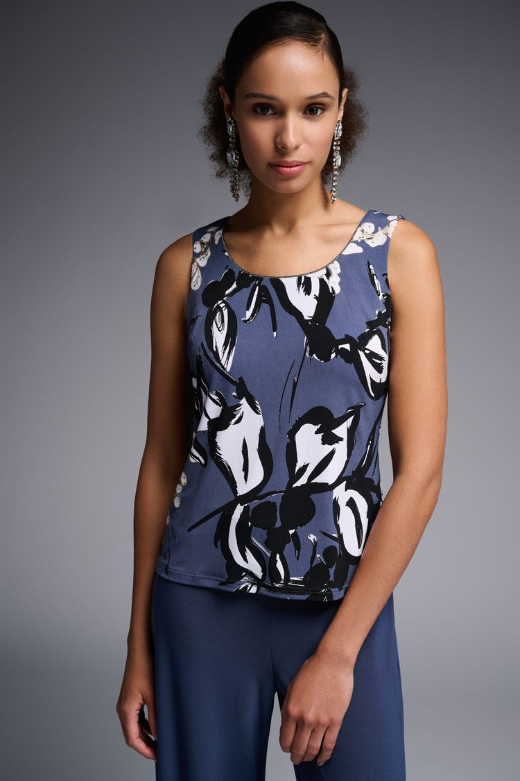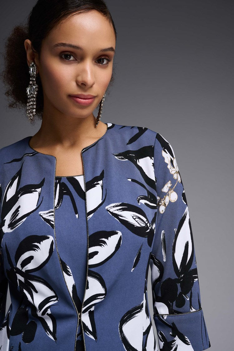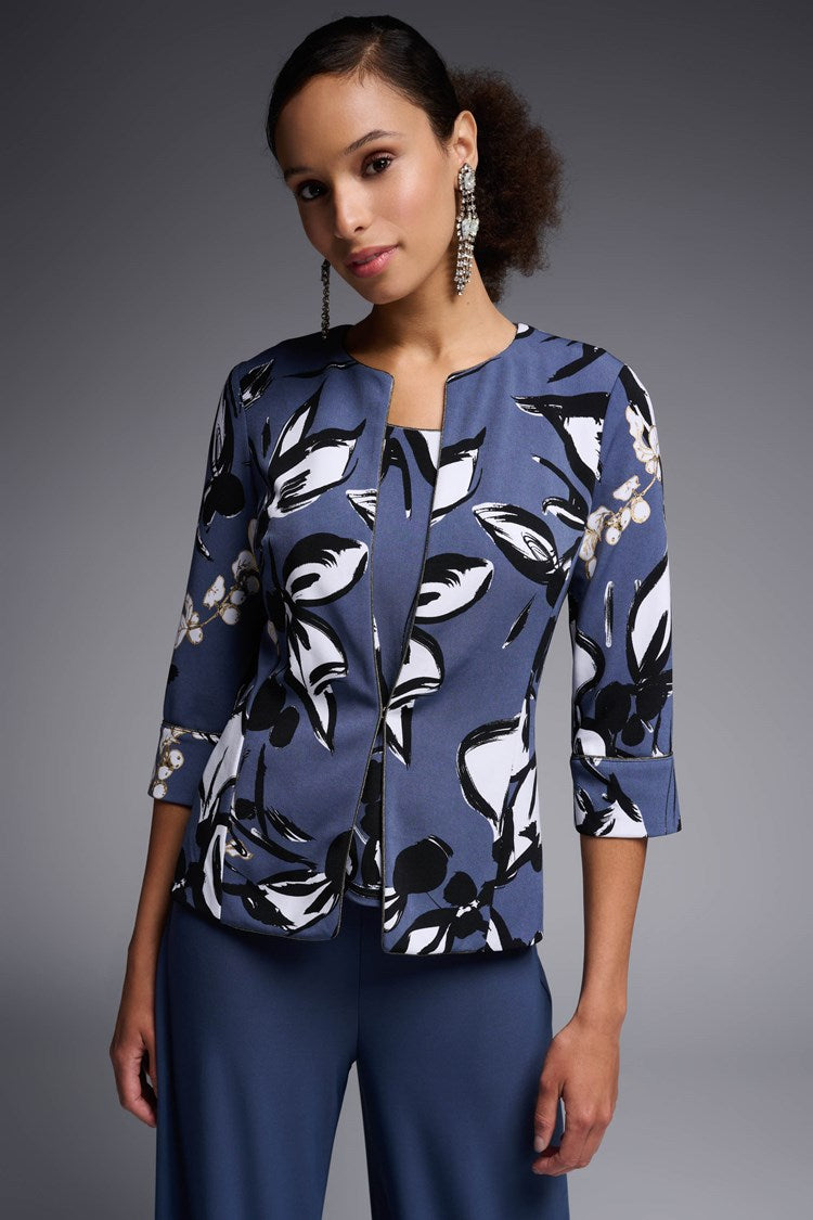 Add some shimmer to your ensemble with this floral foiled silky knit jacket and camisole combo. The fitted jacket features three-quarter cuffed sleeves, a crewneck collar, and a hook and eye closure. The camisole is styled with a scooped neckline and embellished with a glittering gold melange piping that also appears on the jacket. Pair with a classic black pencil skirt or dress pants