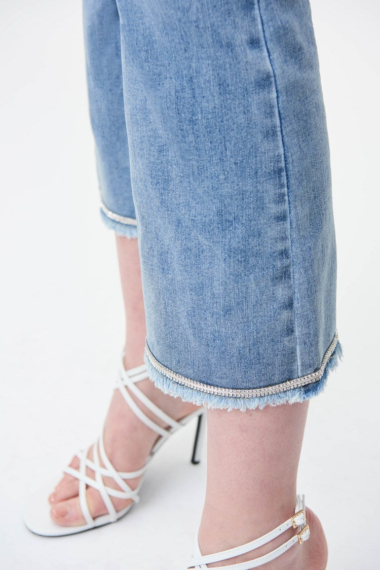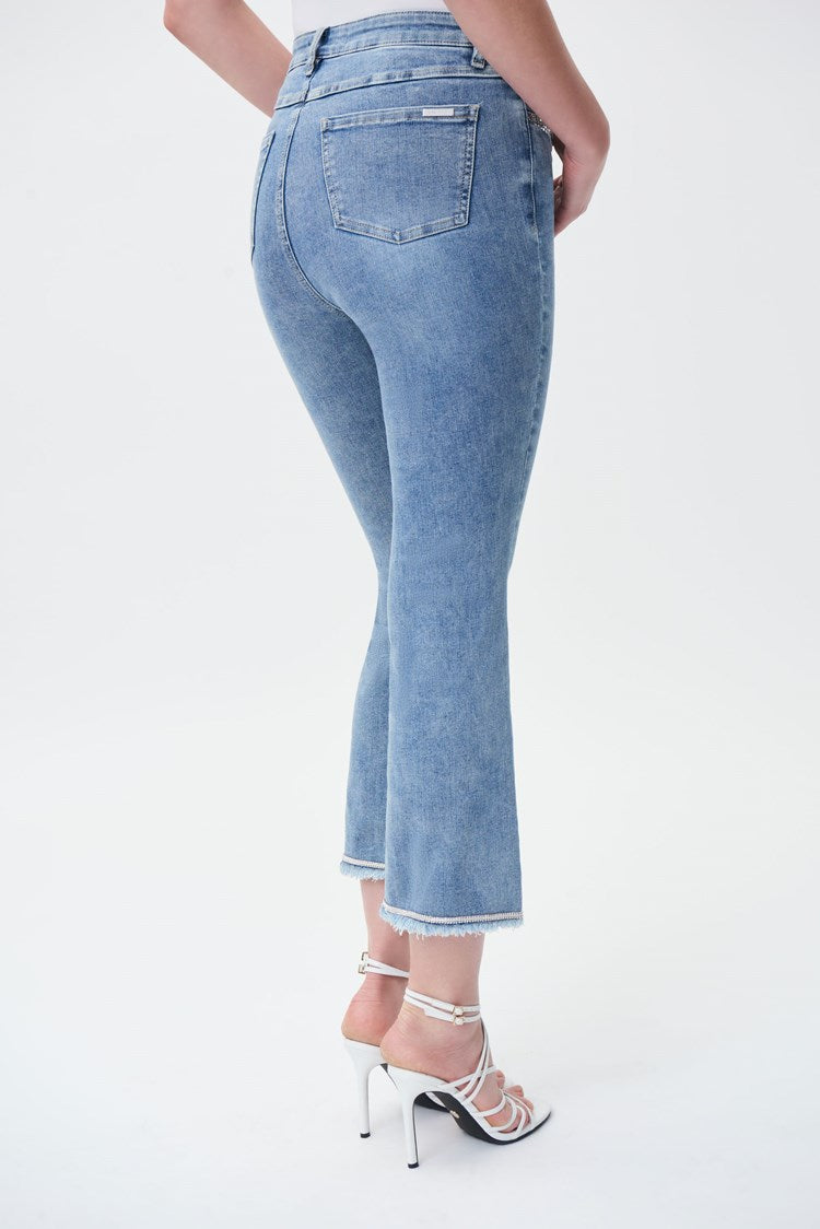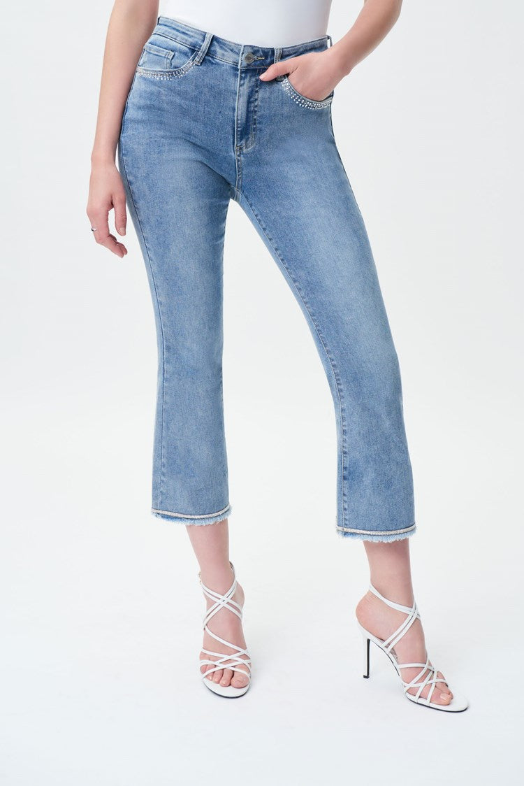 Trends come and go, but a pair of retro-inspired flared-leg, cropped jeans in your wardrobe will have your back season after season. Rhinestones at the front pockets and embellishment details at the hem add a touch of fun. Flattering and versatile, this timeless design features five classic pockets to carry your essentials.