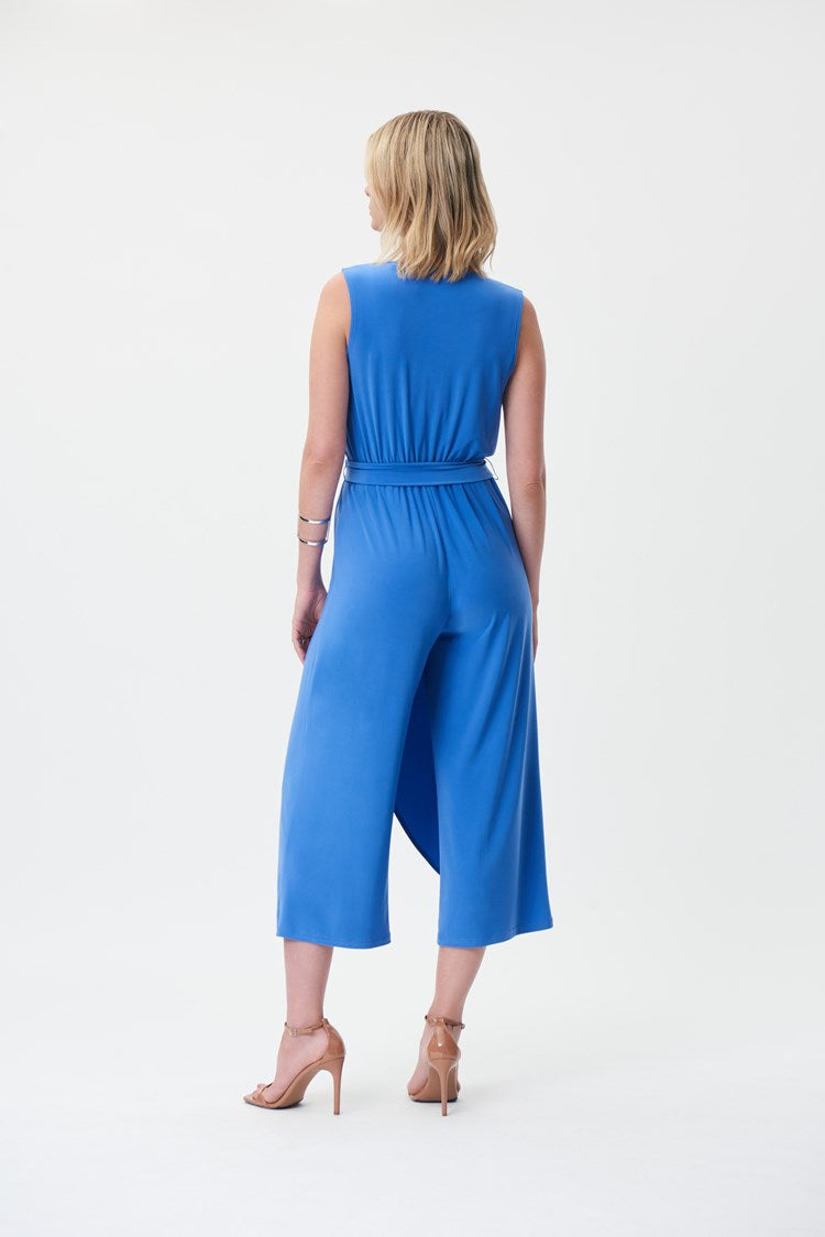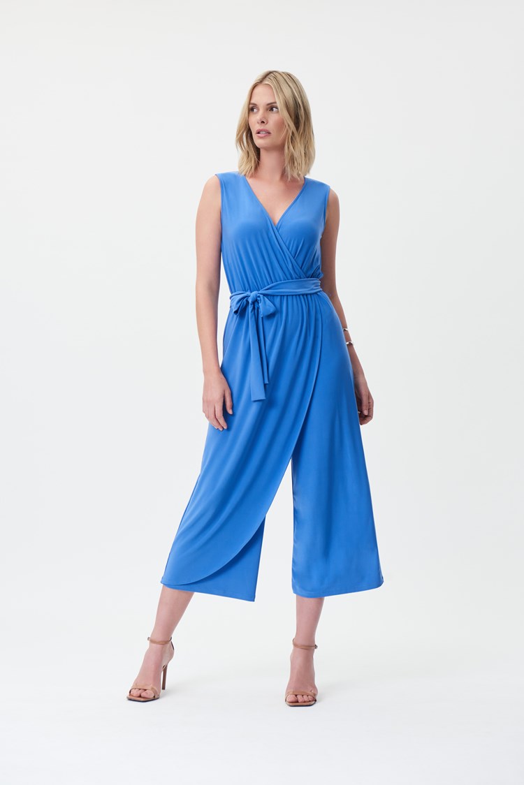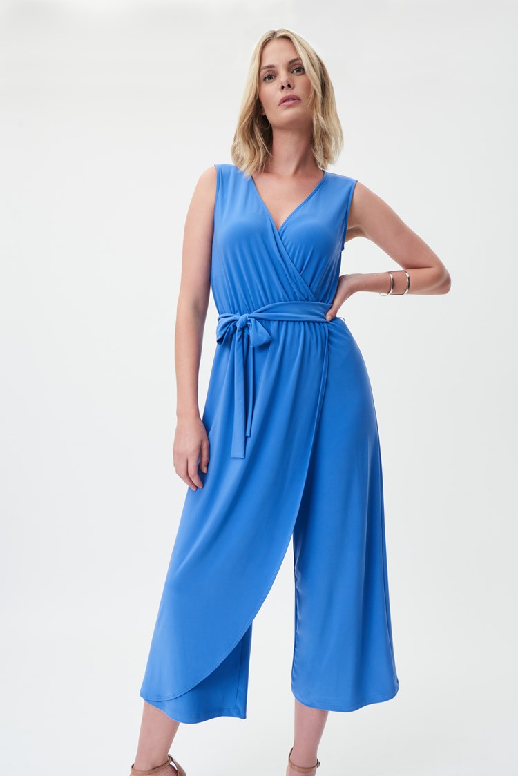 Achieve a cosmopolitan look with this beautiful jumpsuit. Carefully crafted from solid silky knit material, this piece comes with a flattering wide-legged fit and offers wrap paneling around its front bottom for extra accentuation. This sleeveless jumpsuit also comes with a sash belt and a shirred neckline.