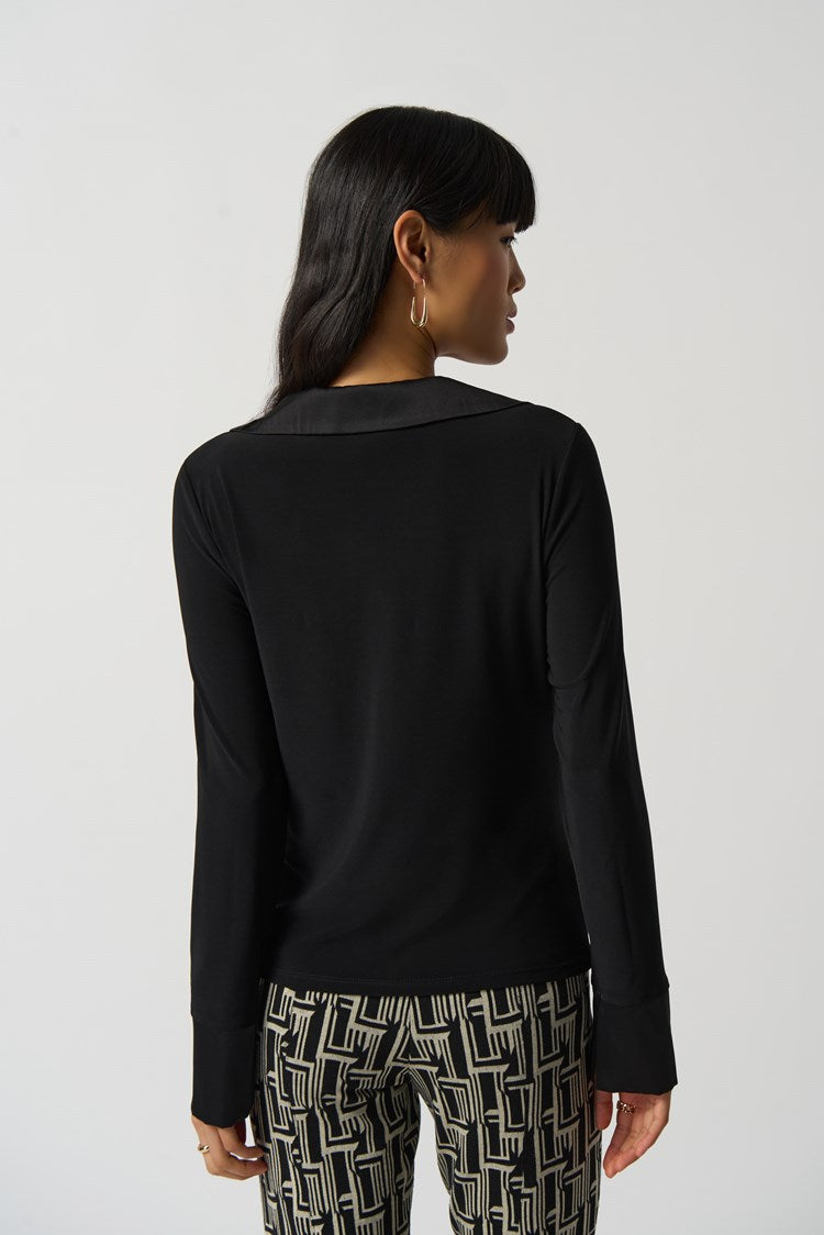 Crafted from a luxurious blend of silky knit and satin, this stunning top is elevated with ruching detail, satin shirt collar and cuffs. It's the perfect pick for desk-to-dinner dressing. Add wide-leg pants and heels or sneakers to complete the look.
