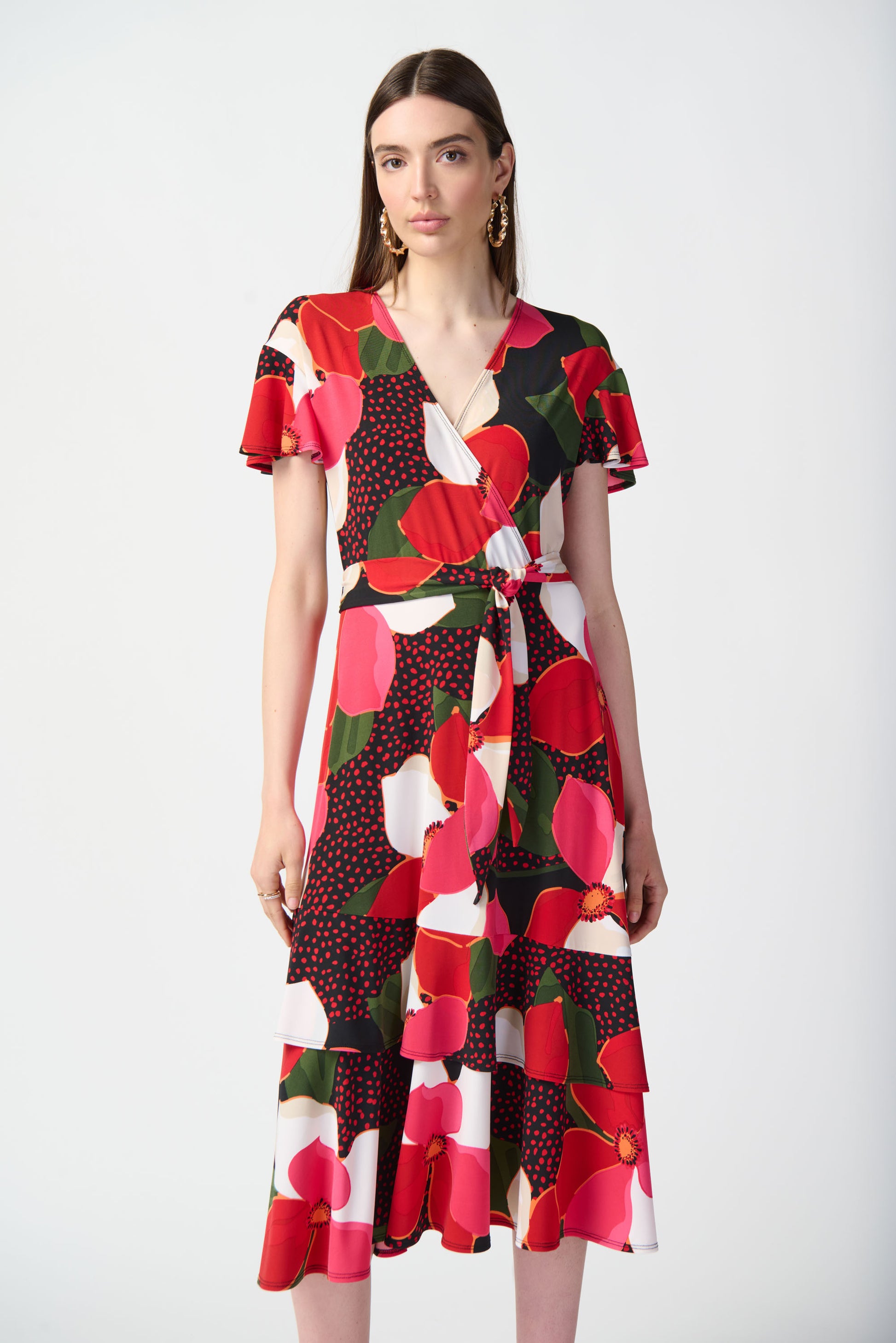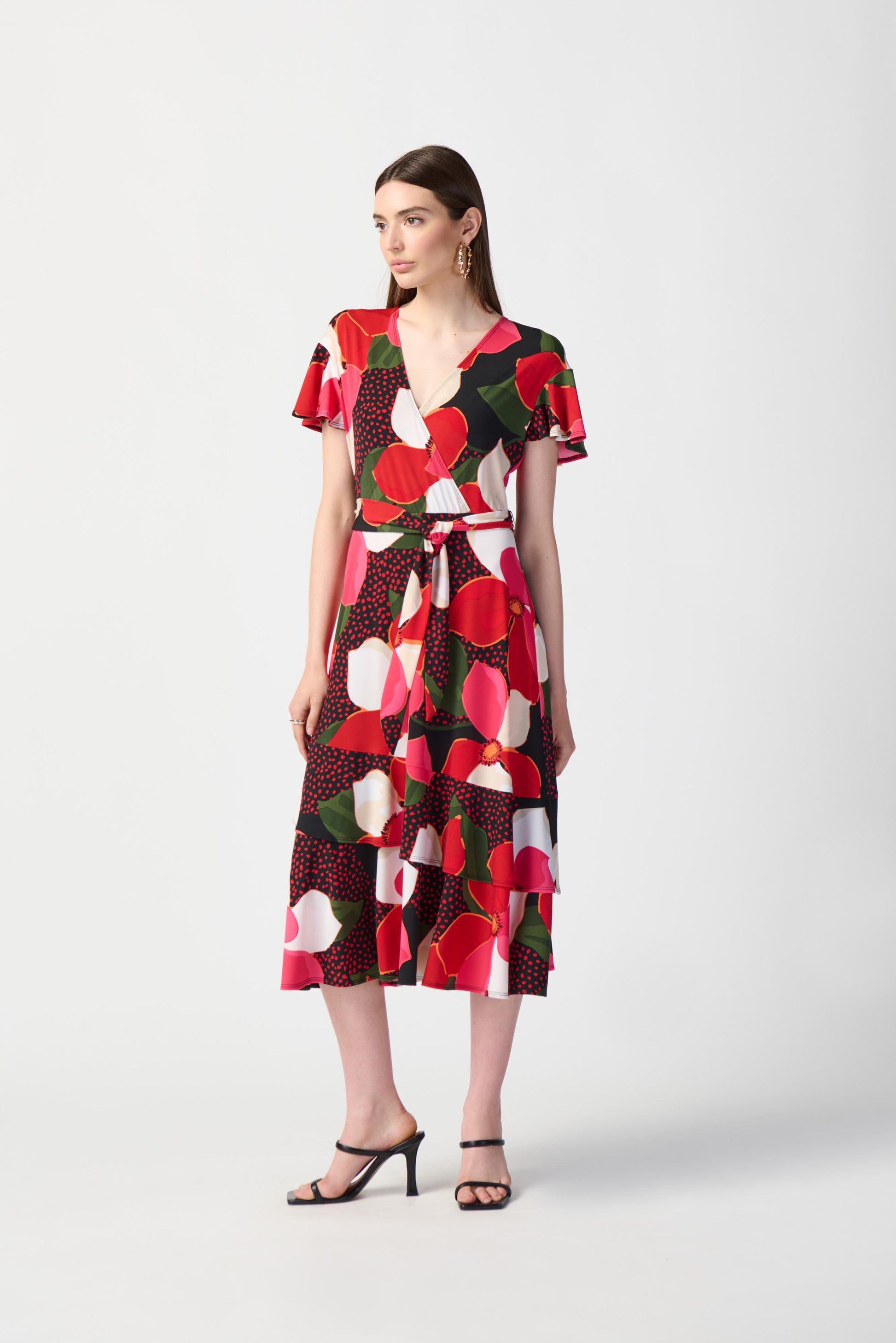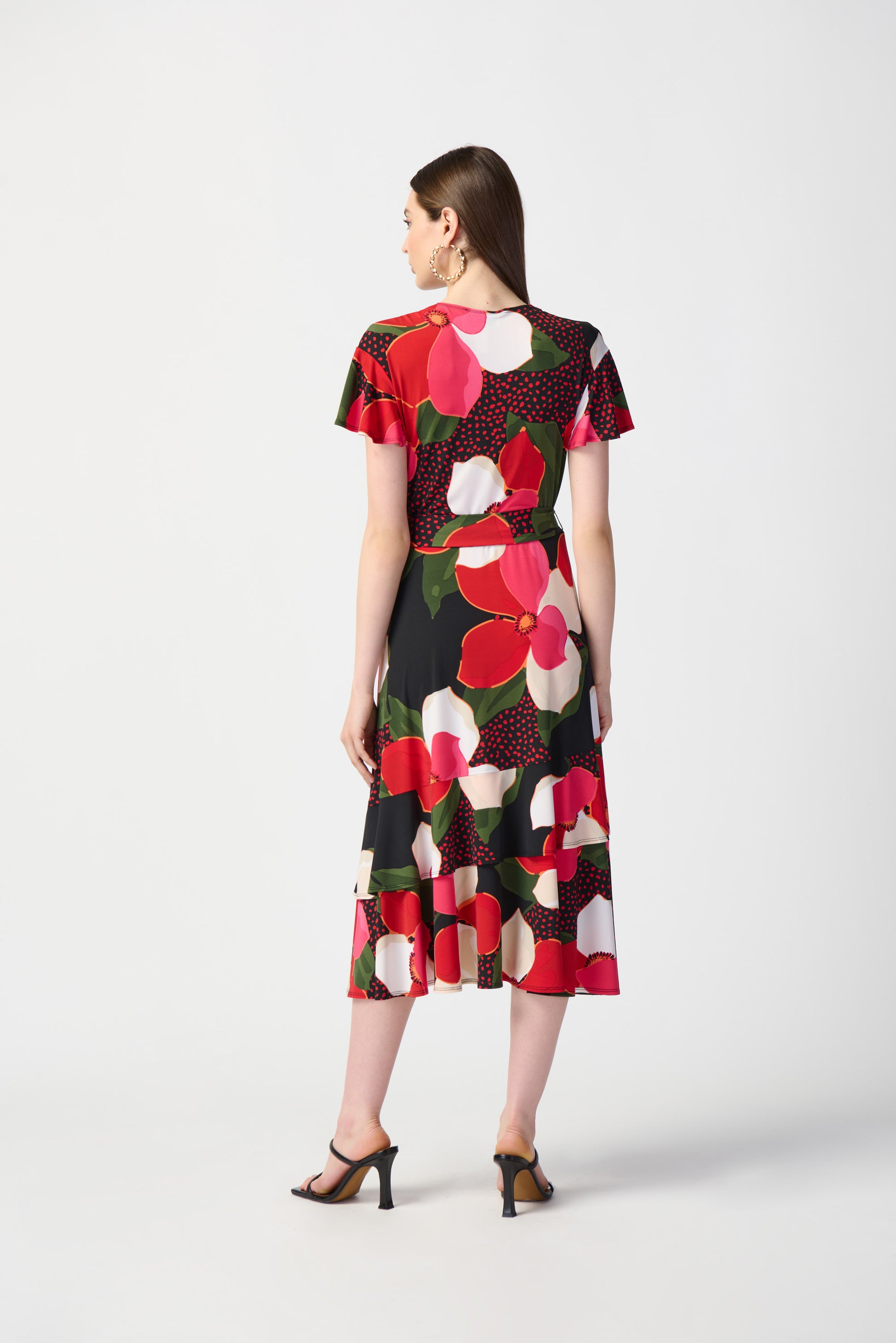 This dress is a blooming beauty. With a floral print and flattering fit-and-flare silhouette, it's a chic and sophisticated choice for any occasion. The short ruffle sleeves and waist sash add an elegant touch, while the knee-length creates a timeless and chic look.