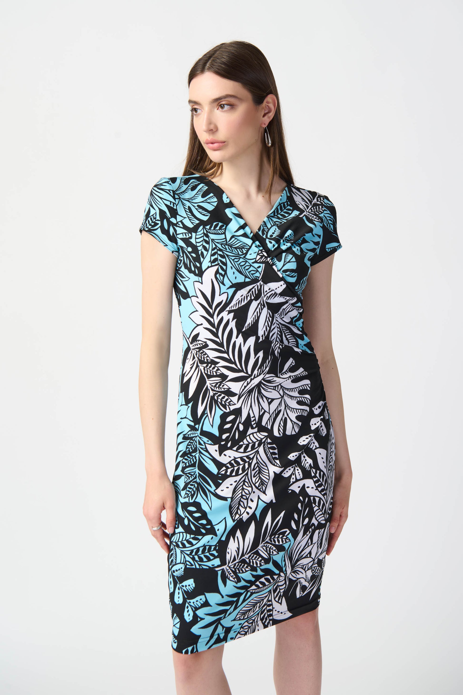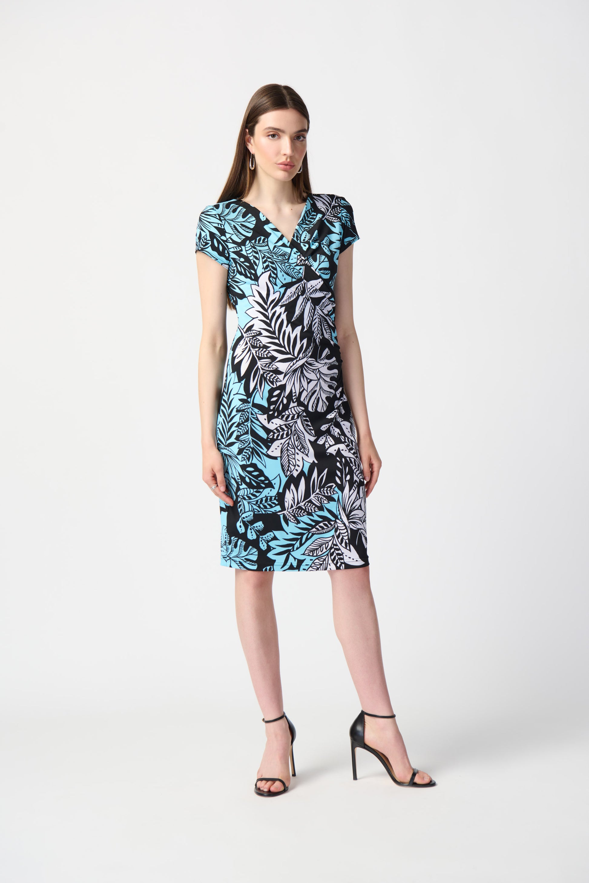 Made from a silky knit fabric, this beautiful wrap dress showcases an eye-catching tropical print and an elegant wrap neckline. Short cap sleeves and flattering shirring at the left waist complete the design. Effortlessly stylish and comfortable, this dress will become a go-to favorite in your summer wardrobe.