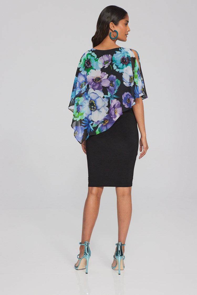 Check out this amazing outfit! It's got a beautiful floral print chiffon poncho that flows gracefully over a silky knit sheath dress. The dress has a fun and flirty asymmetrical hem, along with a boat neckline and shoulder slits for a touch of elegance. It's a perfect combination of style and comfort!