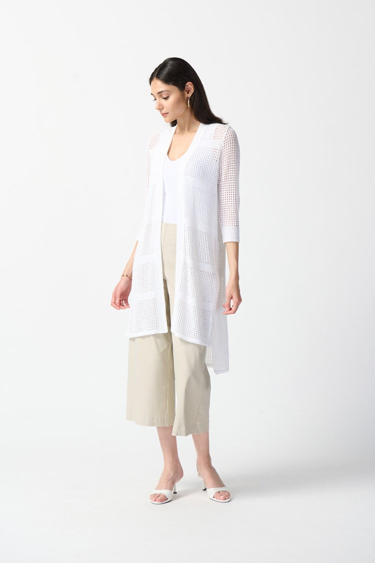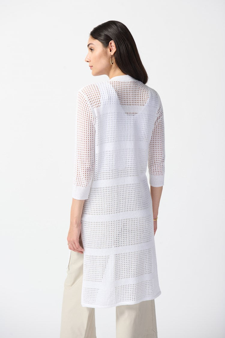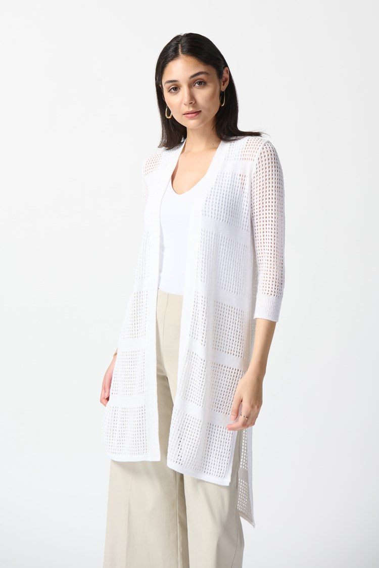 Wrap yourself in the cozy allure of this tape yarn open stitch cover-up sweater. Its hi-low hem, adorned with side slits, adds flair, while three-quarter sleeves exude casual chic. Embrace comfort without compromising style with this no-closure beauty.