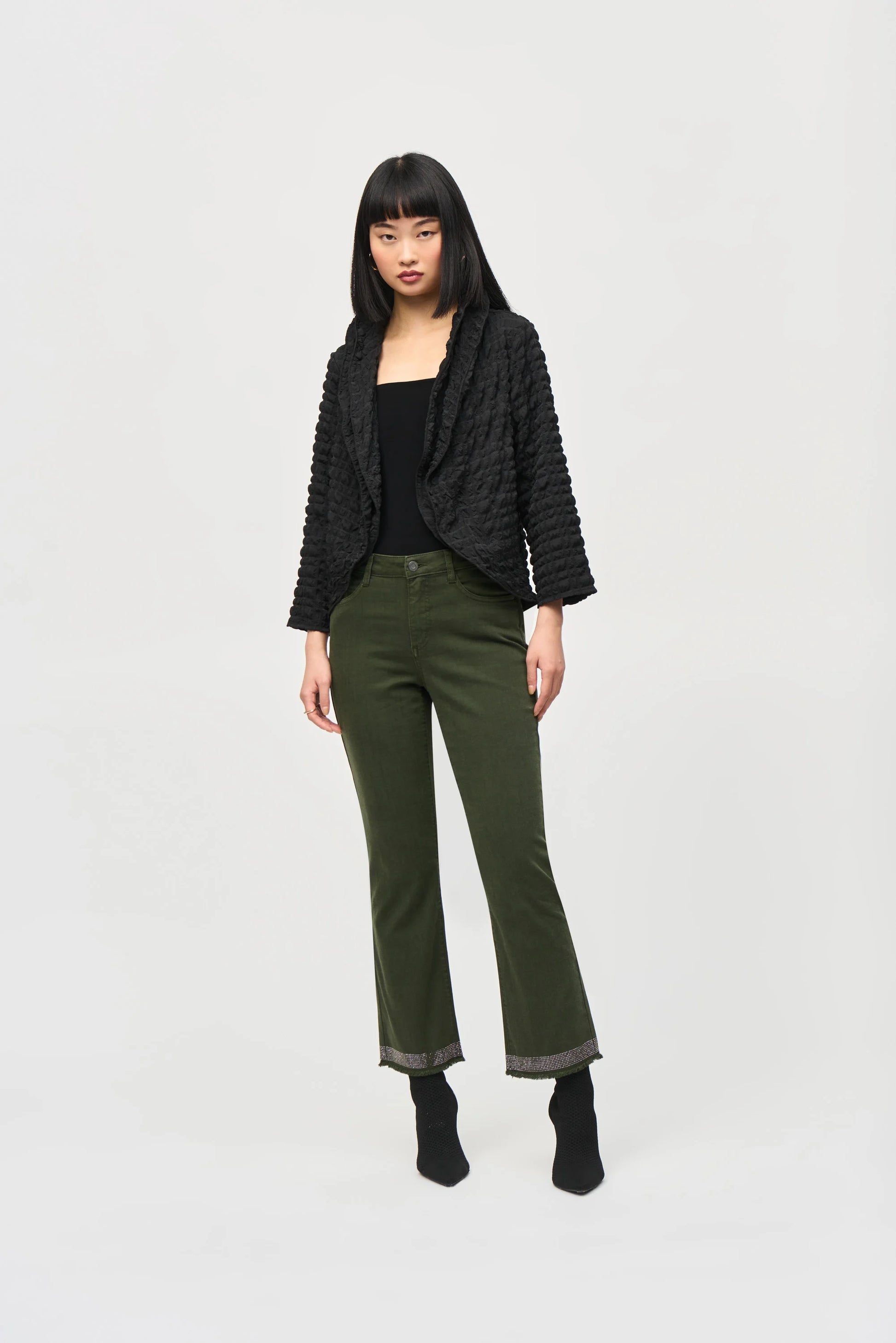 This woven jacket effortlessly combines comfort and contemporary chic. Boasting a bold bubble texture, the piece features a double-wired shawl collar that creates a distinctive frame, accentuating the neckline. The opened three-quarter bell sleeves add a stylish dimension to the fit and flare silhouette.