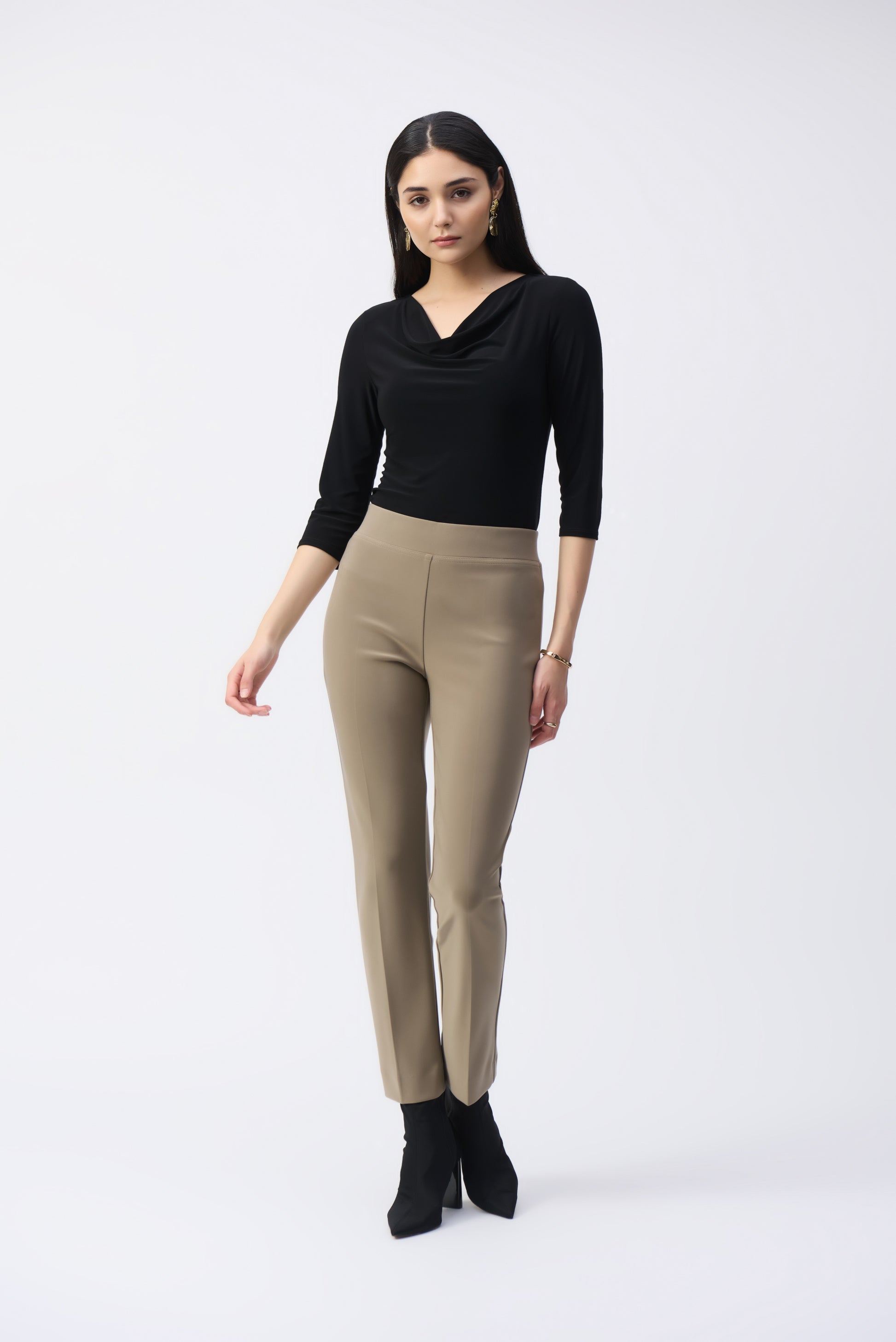 Flaunt your flair for fashion in this charming silky knit top. The cowl neck lends a bold appeal while the three-quarter sleeves complement the garment’s versatile look. The straight silhouette creates a flattering silhouette that is both comfortable and elegant, the perfect way to carry you seamlessly from the office to cocktail hour.