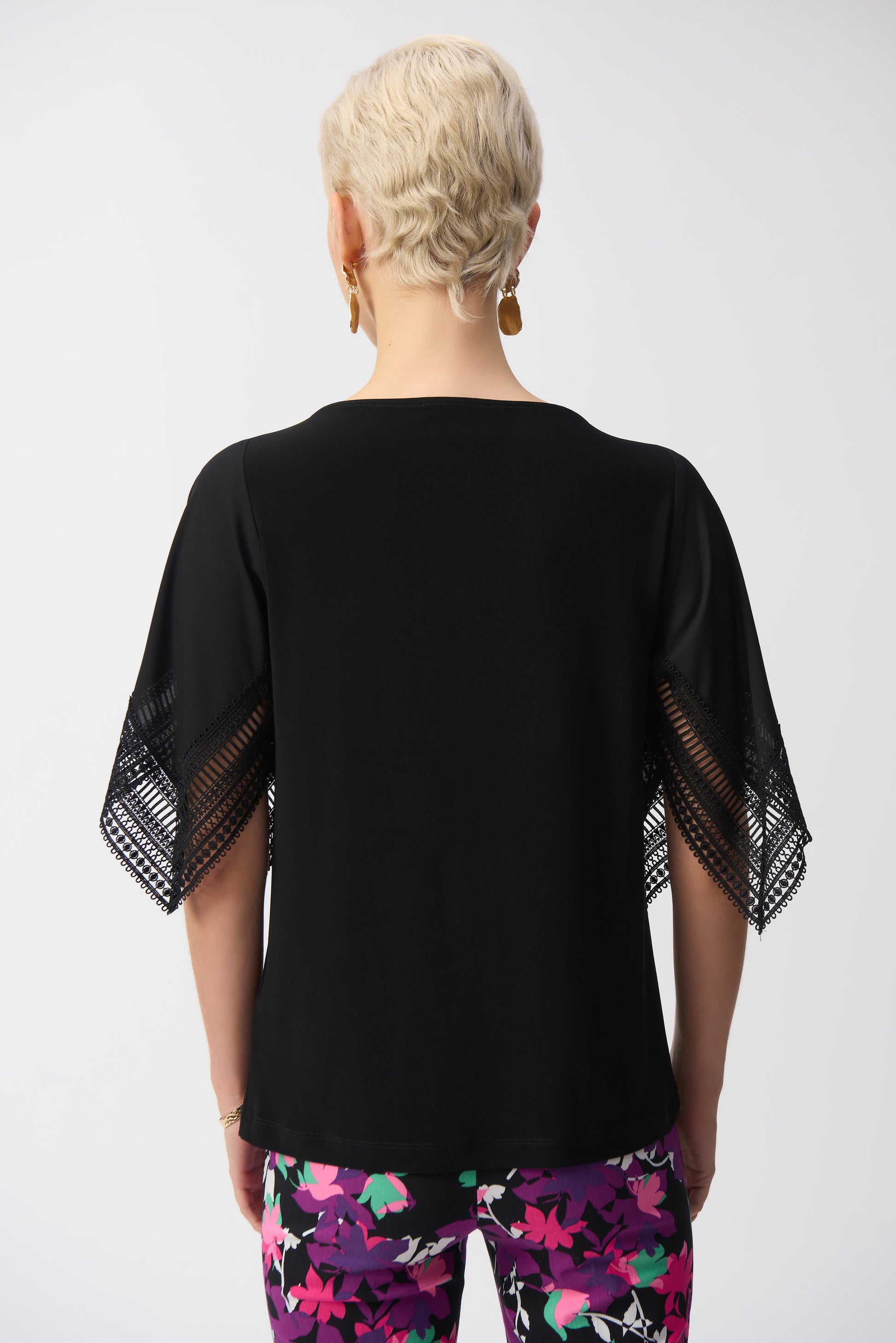 This remarkable silky knit top is perfect for any occasion. The three-quarter handkerchief sleeves, tailored in georgette fabric with delicate guipure at the hem, bring an airy feel to this contemporary design. The boat neckline adds finesse to the look and elevates the garment’s classic straight silhouette.