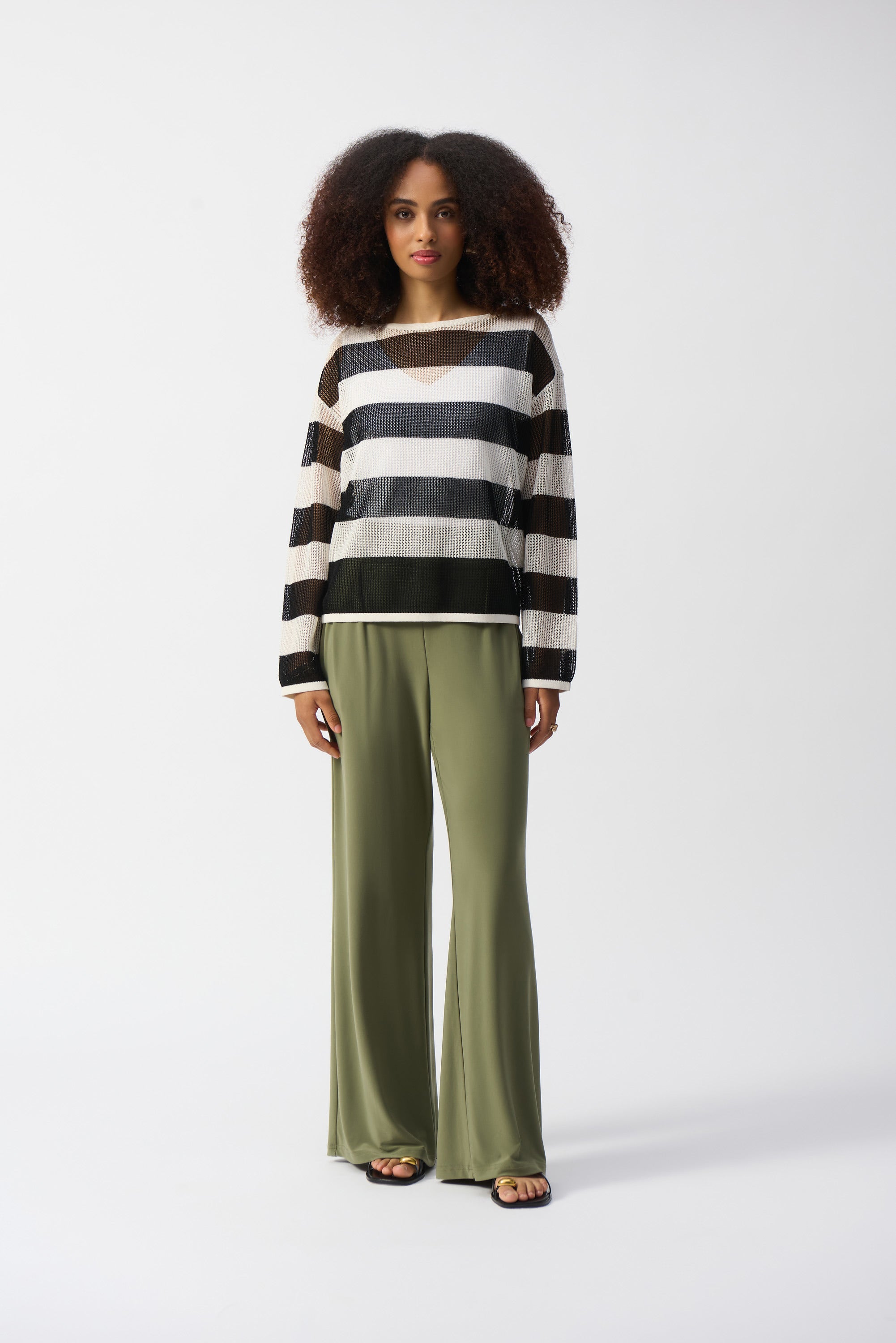 Bold stripes and a lightweight sweater knit come together to create a casual pullover that's anything but ordinary. Framed by long sleeves and a flattering boat neckline, this charming top displays open stitch detailing that brings a unique touch.