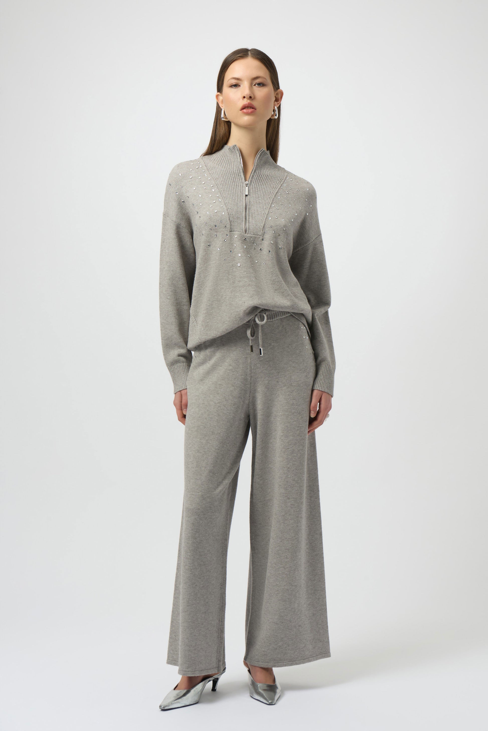 Featuring a zippered ribbed mock collar, long straight sleeves with ribbed cuffs, and eye-catching rhinestone embellishments, this pullover blends style with practicality. The perfect layering piece, it’s crafted from soft, lightweight sweater knit that drapes beautifully over the body.