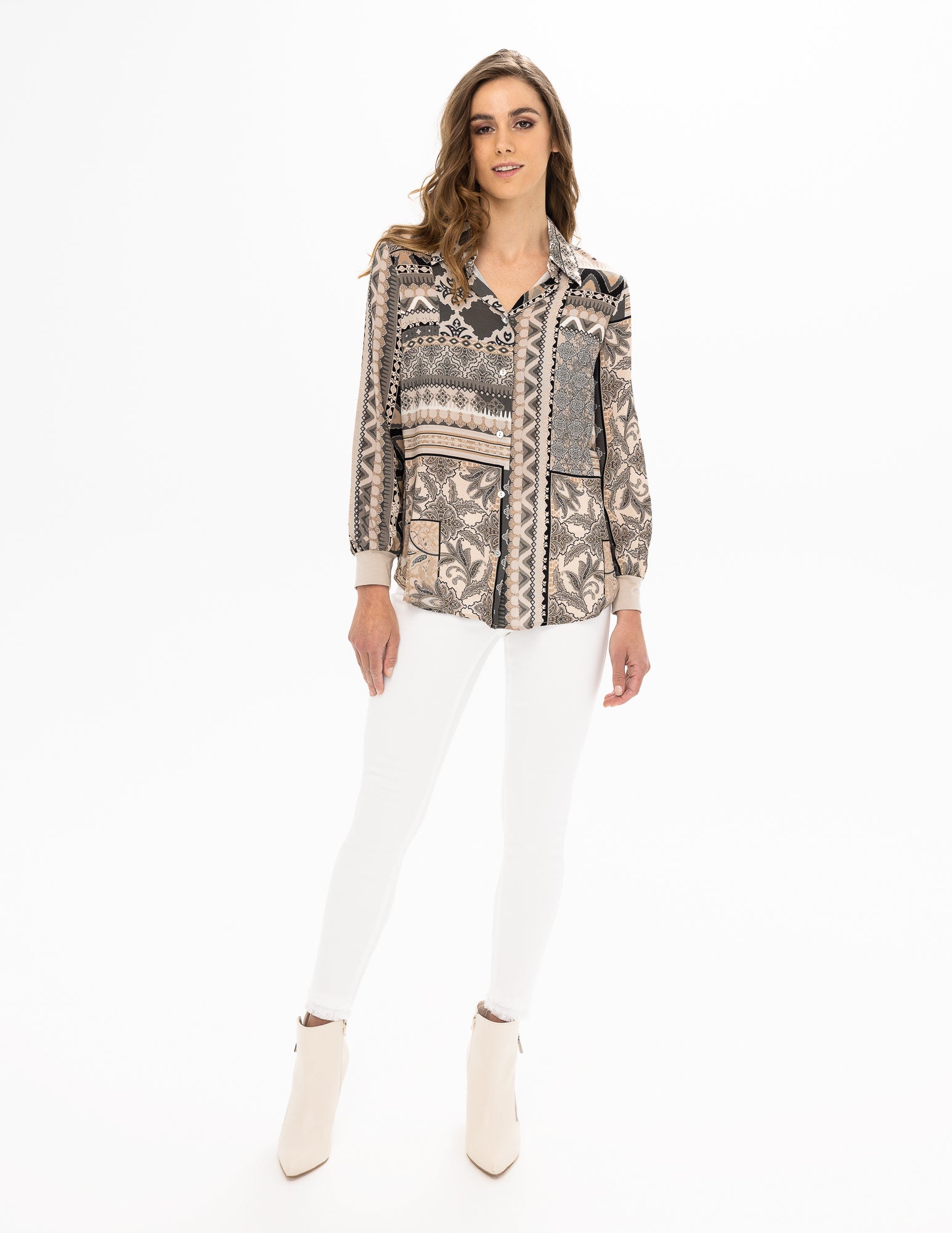 A must have collared blouse with a button placket and a knit cuff at sleeve. Beautiful print available in 2 color ways