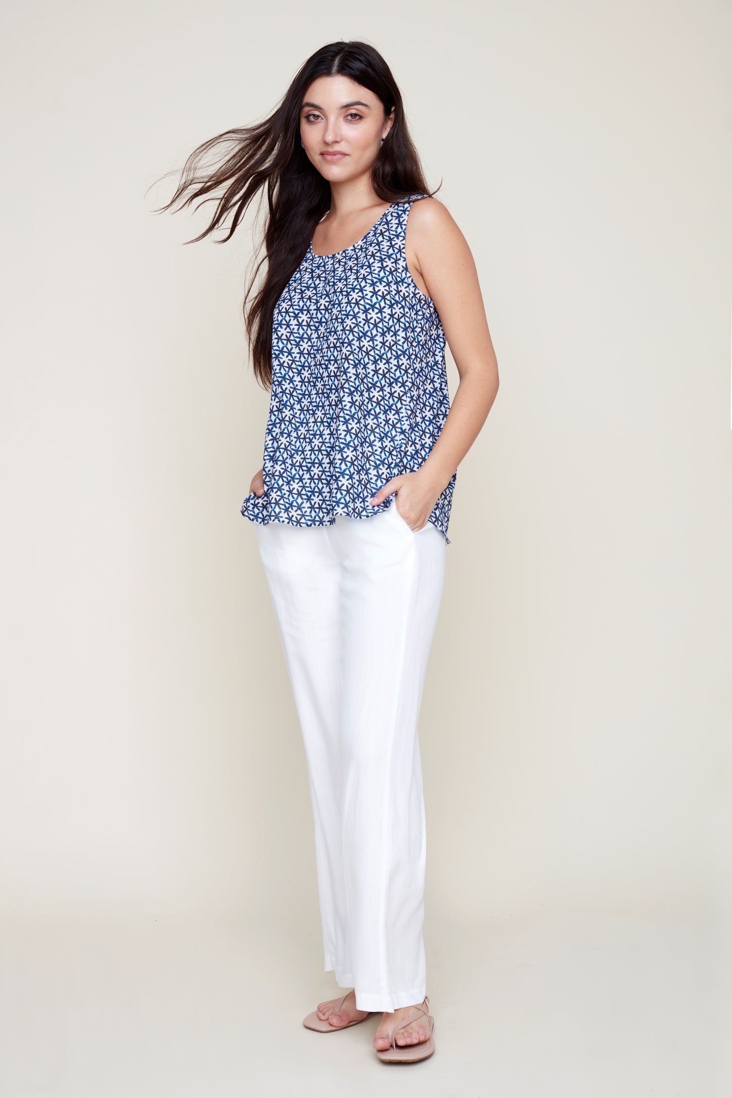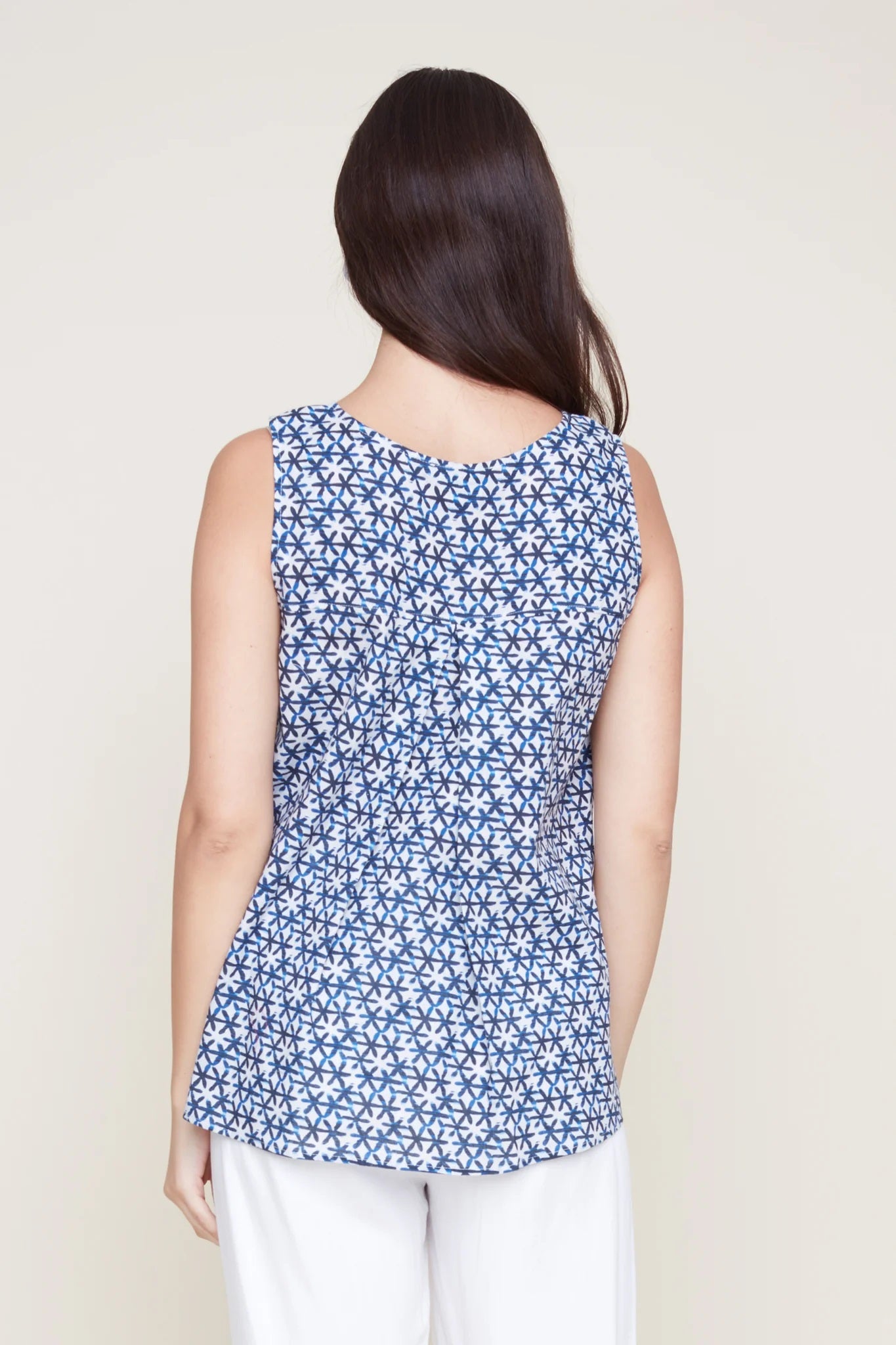 Introducing our stunning sleeveless blouse, crafted from a luxurious linen-cotton blend. This must-have summer piece features beautiful blue and indigo hues, perfect for adding a touch of color to your warm-weather wardrobe. Designed for ultimate comfort and style, this blouse pairs effortlessly with jeans or white bottoms, making it an essential addition to your collection. Stay cool and chic all season long with this versatile and elegant blouse.