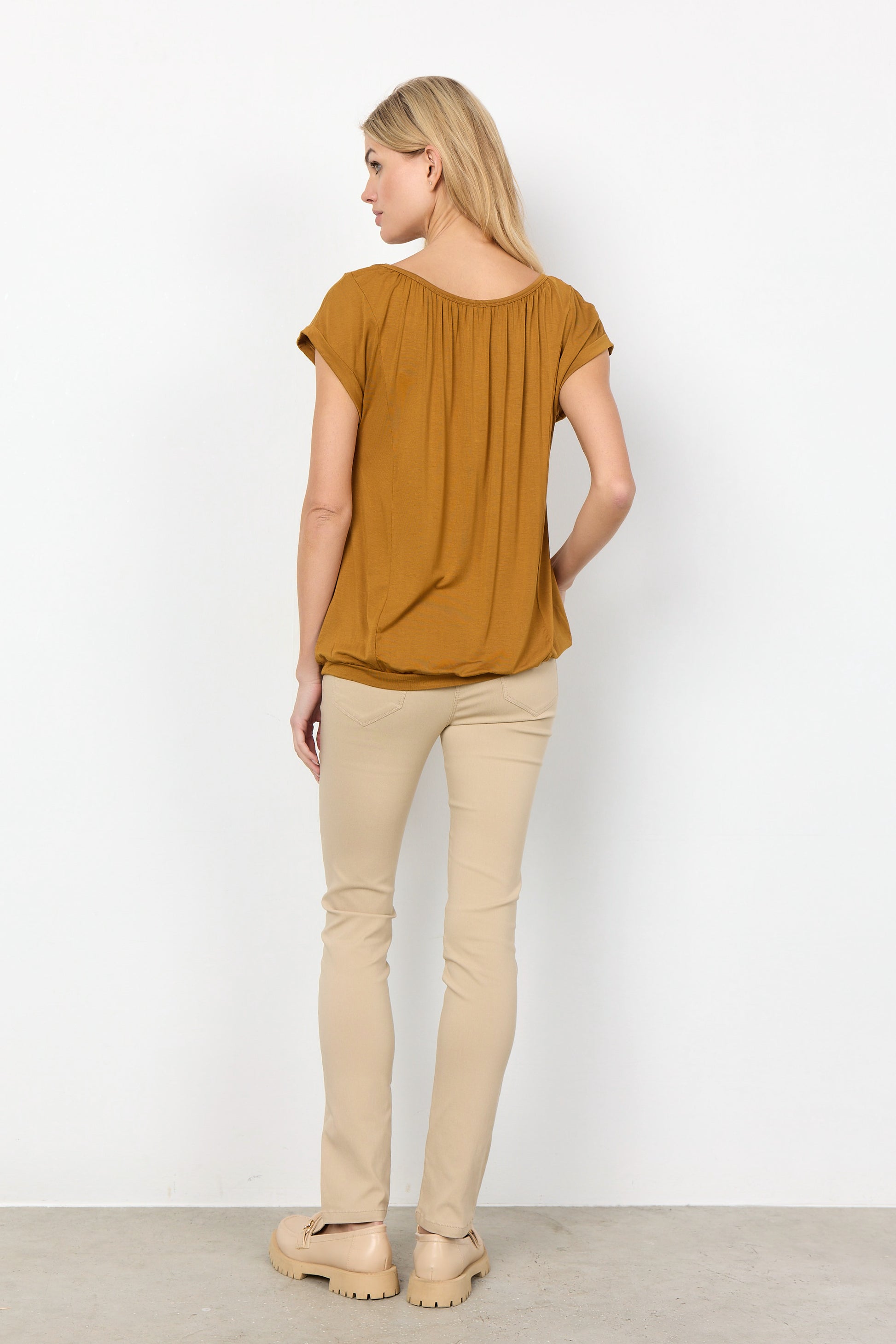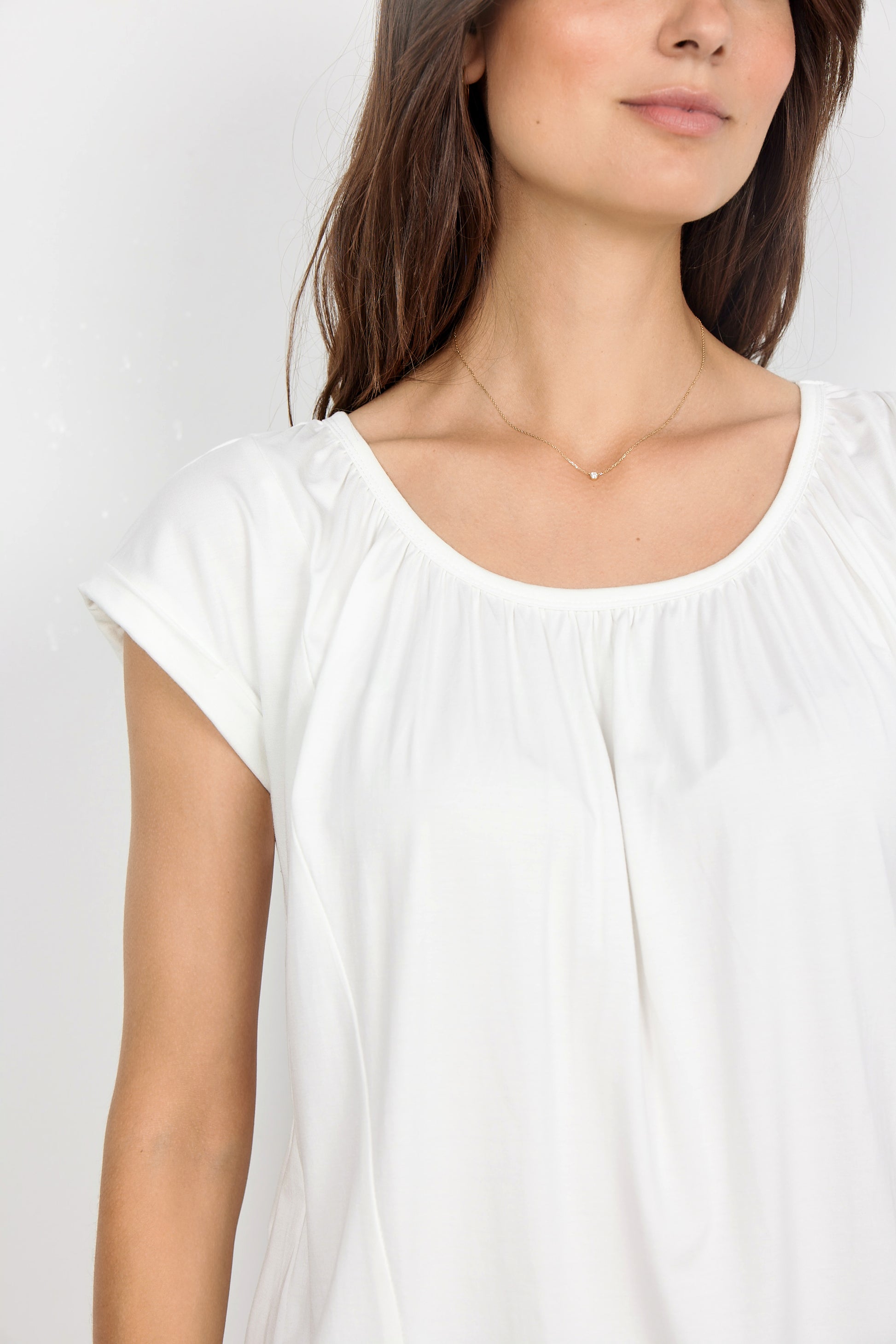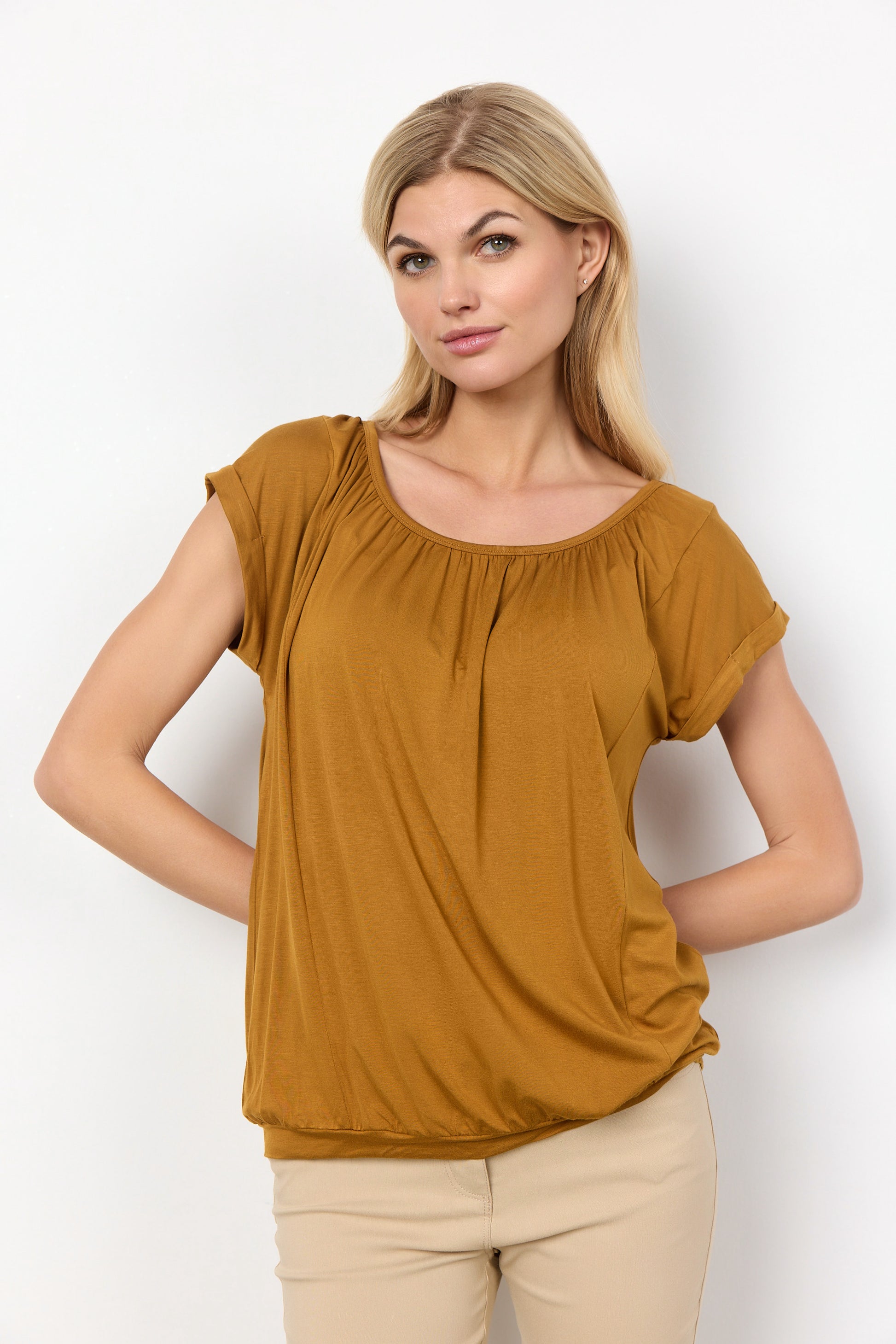 The Marica 4 is a nice t-shirt in a lyocell and Spandex blend quality. The t-shirt has a round neckline with a pleated detail and roll-up short sleeves. Pair it with your favorite pair of jeans and sneakers for an everyday look.