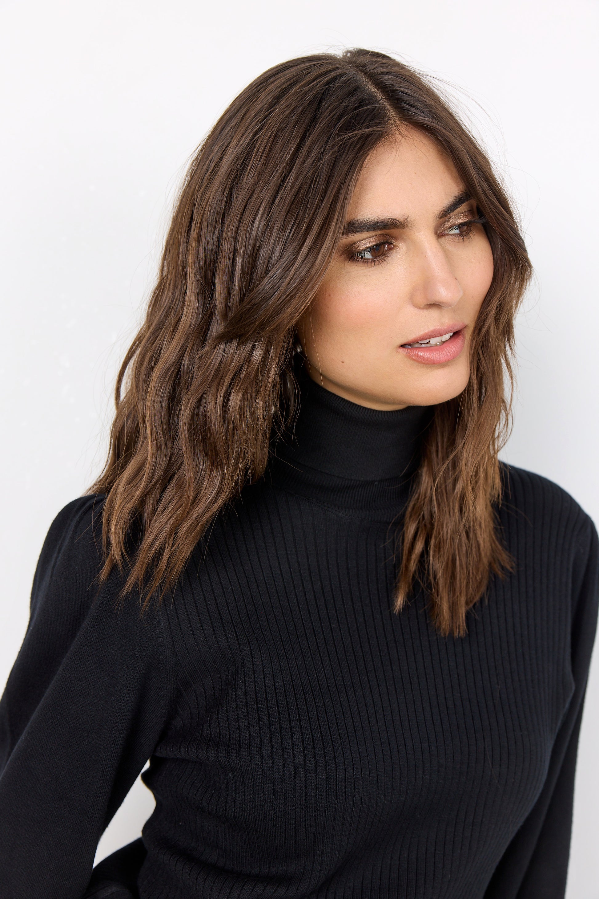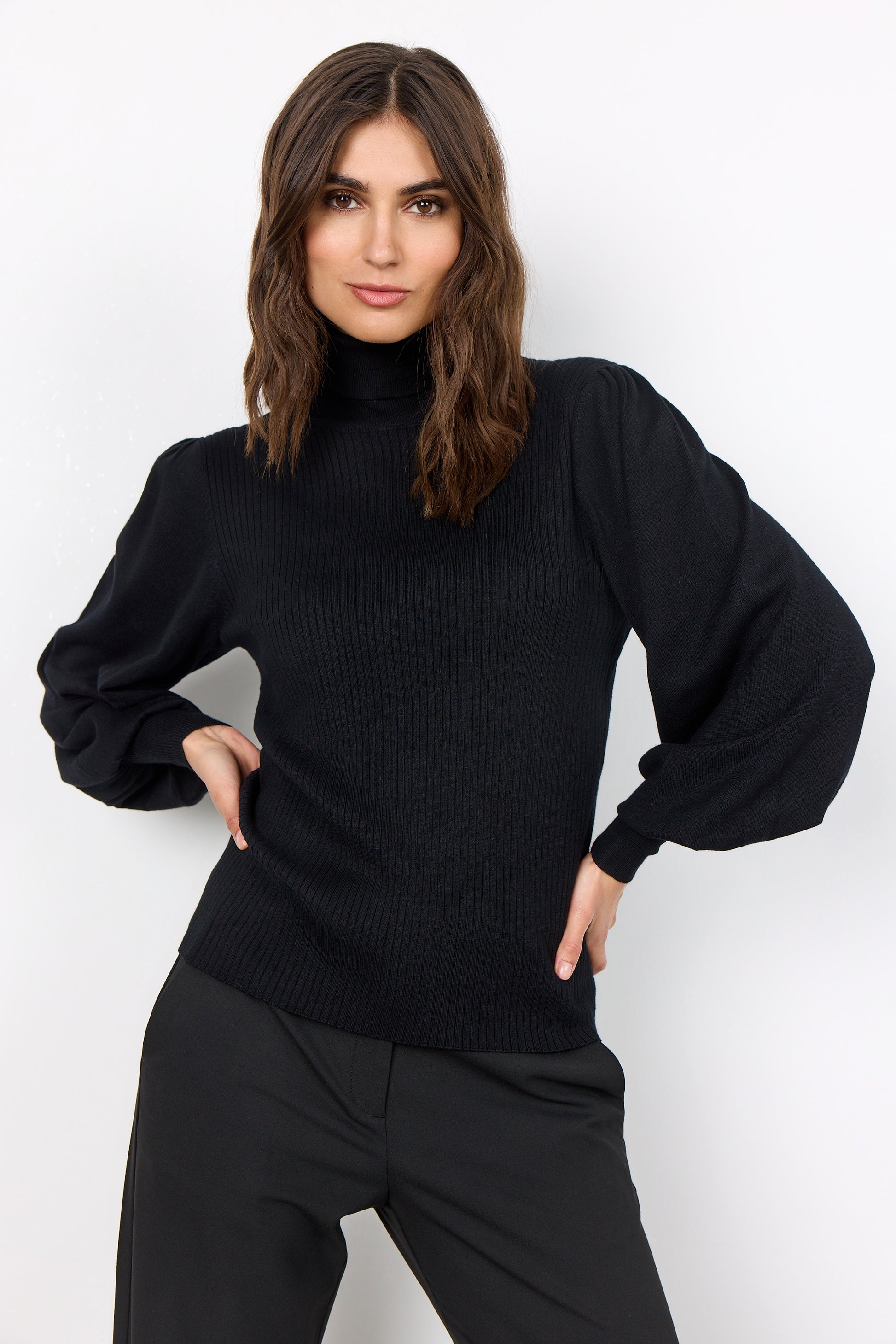 A classic and elegant pullover made from a beautiful blend of viscose and nylon. This Dollie pullover features a roll neck, long balloon sleeves and a tight fit. Style it with a pair of black jeans and some sneakers for an easy feminine look.