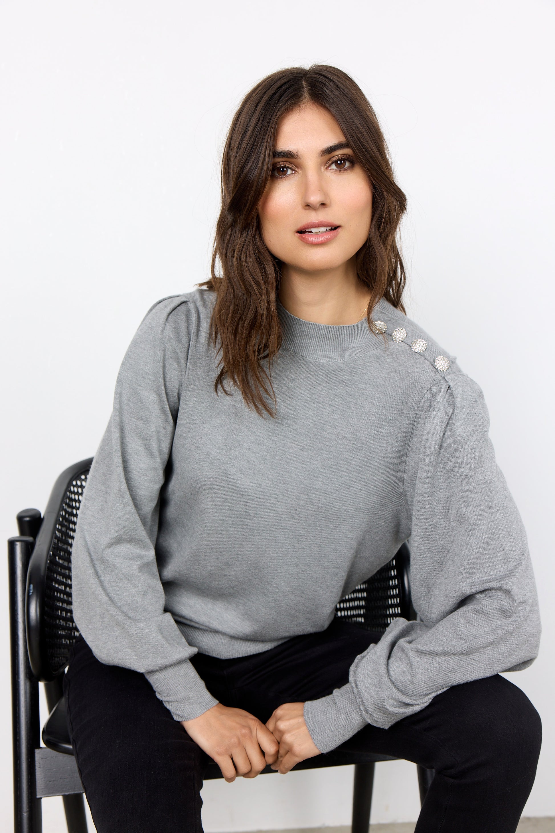 A classic pullover made from a nice blend of viscose and nylon. The pullover has a high neckline, long balloon sleeves, a comfortable fit and a nice button detail at the shoulder. Style this lovely pullover with your favorite trousers and some loafers for an elegant look