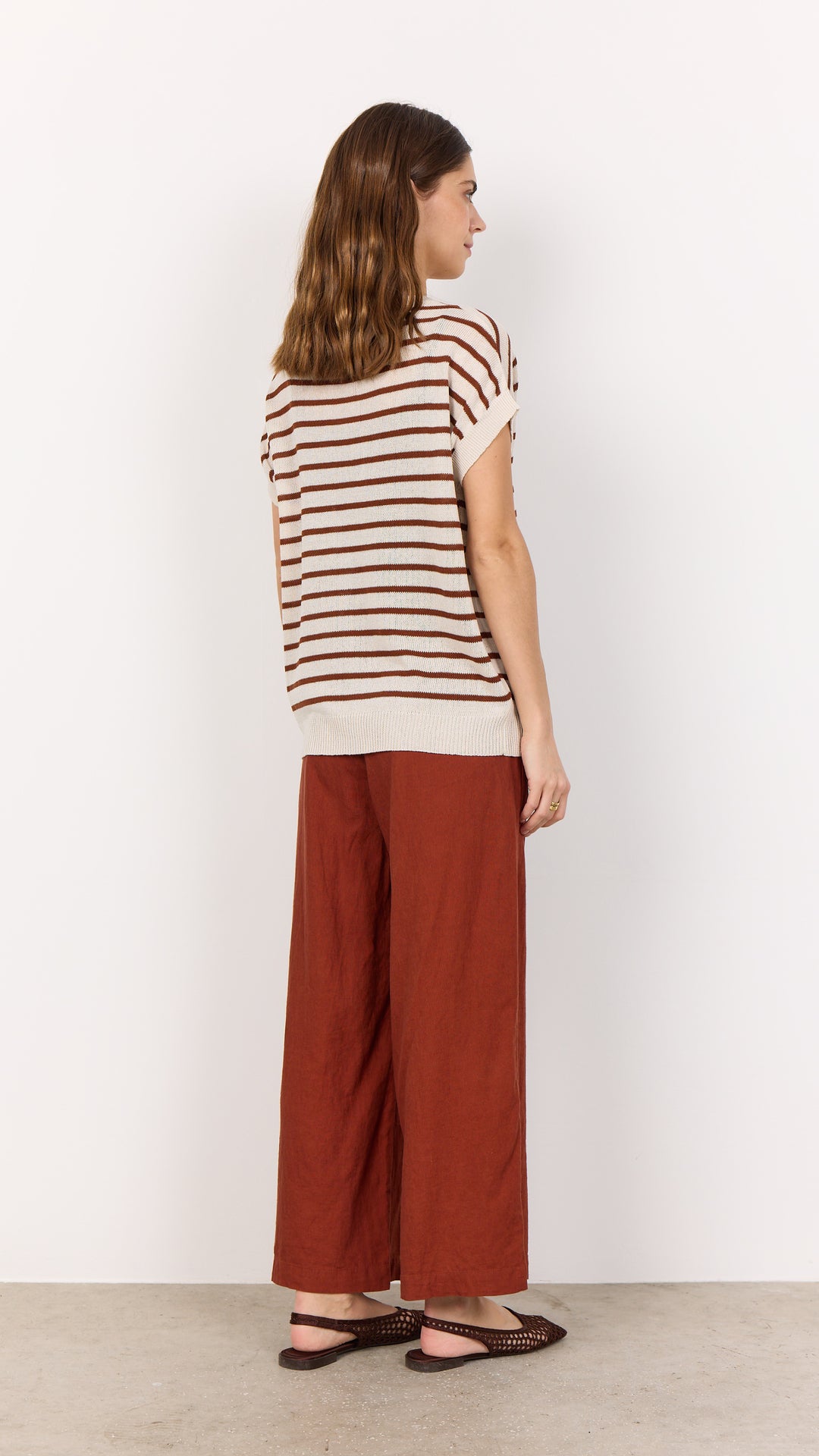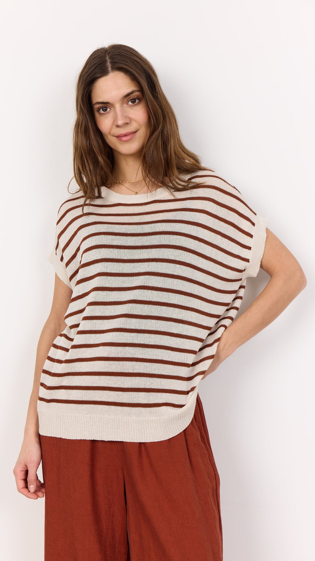 A comfortable t-shirt that has a relaxed fit with a ribbed collar and features a striped pattern with a textured finish. This T-shirt can be paired with various bottoms and layered under jackets for a casual look.