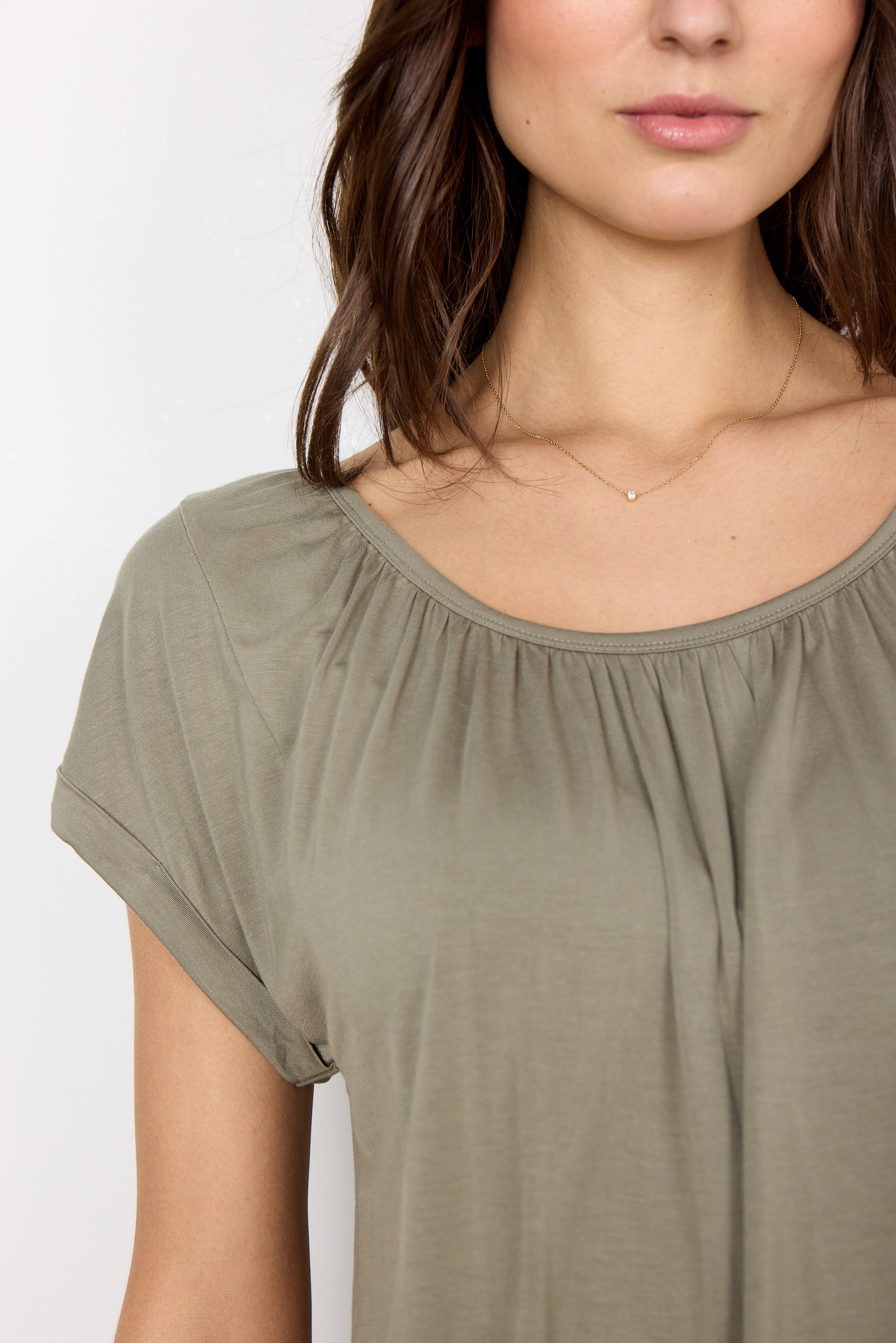 The Marica 4 is a nice t-shirt in a lyocell and Spandex blend quality. The t-shirt has a round neckline with a pleated detail and roll-up short sleeves. Pair it with your favorite pair of jeans and sneakers for an everyday look.