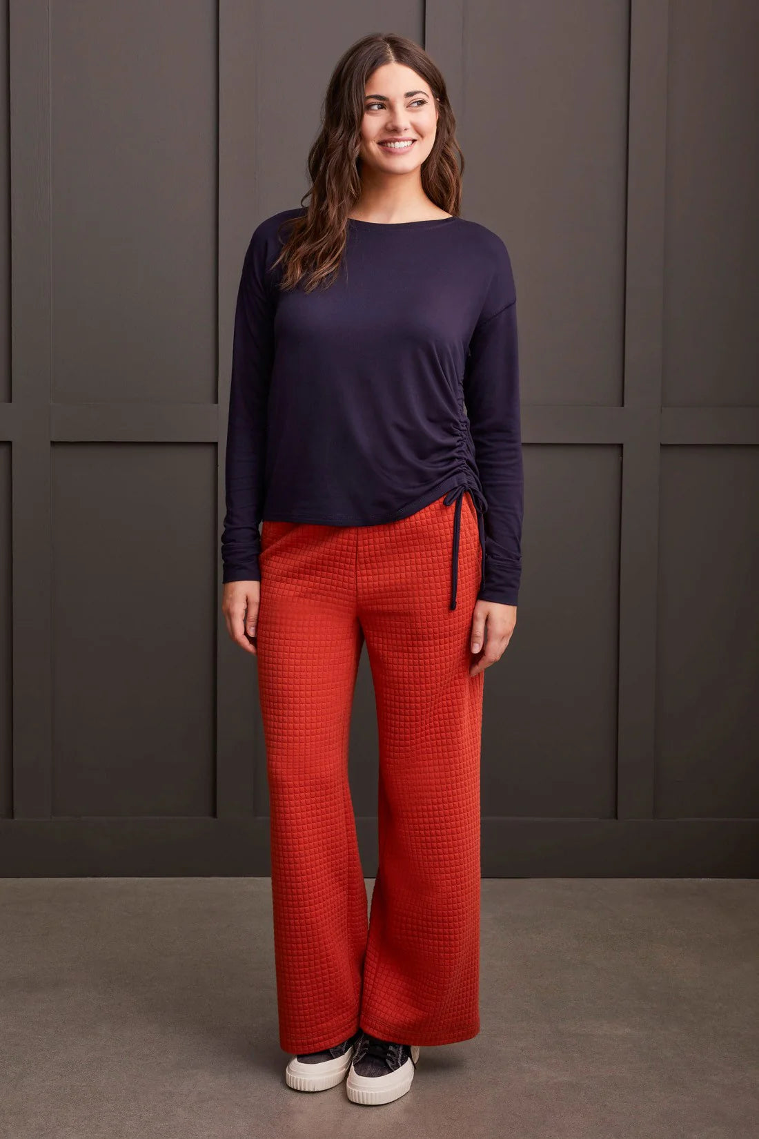 Comfort that doesn't compromise on style. With super soft French terry fabric combined with flatlock stitching that lays smooth, you'll want to wear this long-sleeve crew neck top every day of the week. The left side rushing with an adjustable drawcord detail adds a playfully customizable twist.