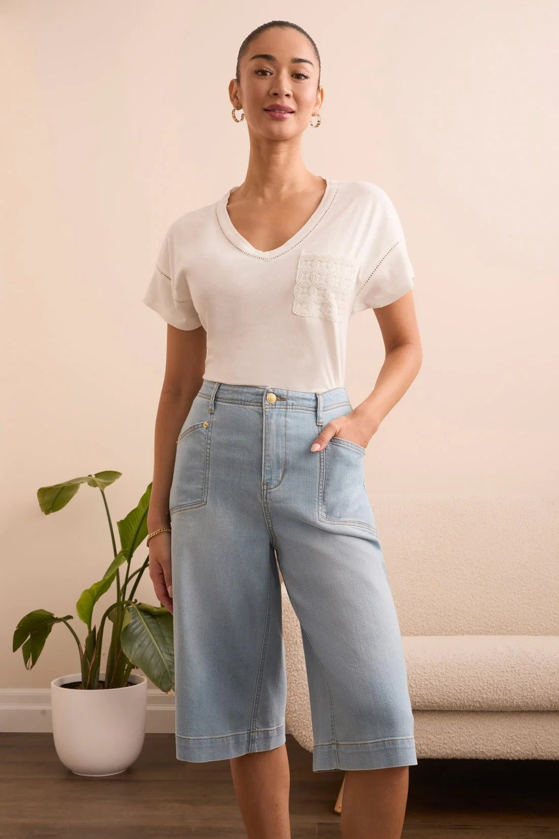 Crafted from lightweight stretch denim, these palazzo capris offer a relaxed fit with a girlfriend-style waist and flowy palazzo leg. The stretchy fabric ensures comfort all day, while spacious patch pockets add practicality. A classic button and zipper closure at the waist completes the look with a polished touch.