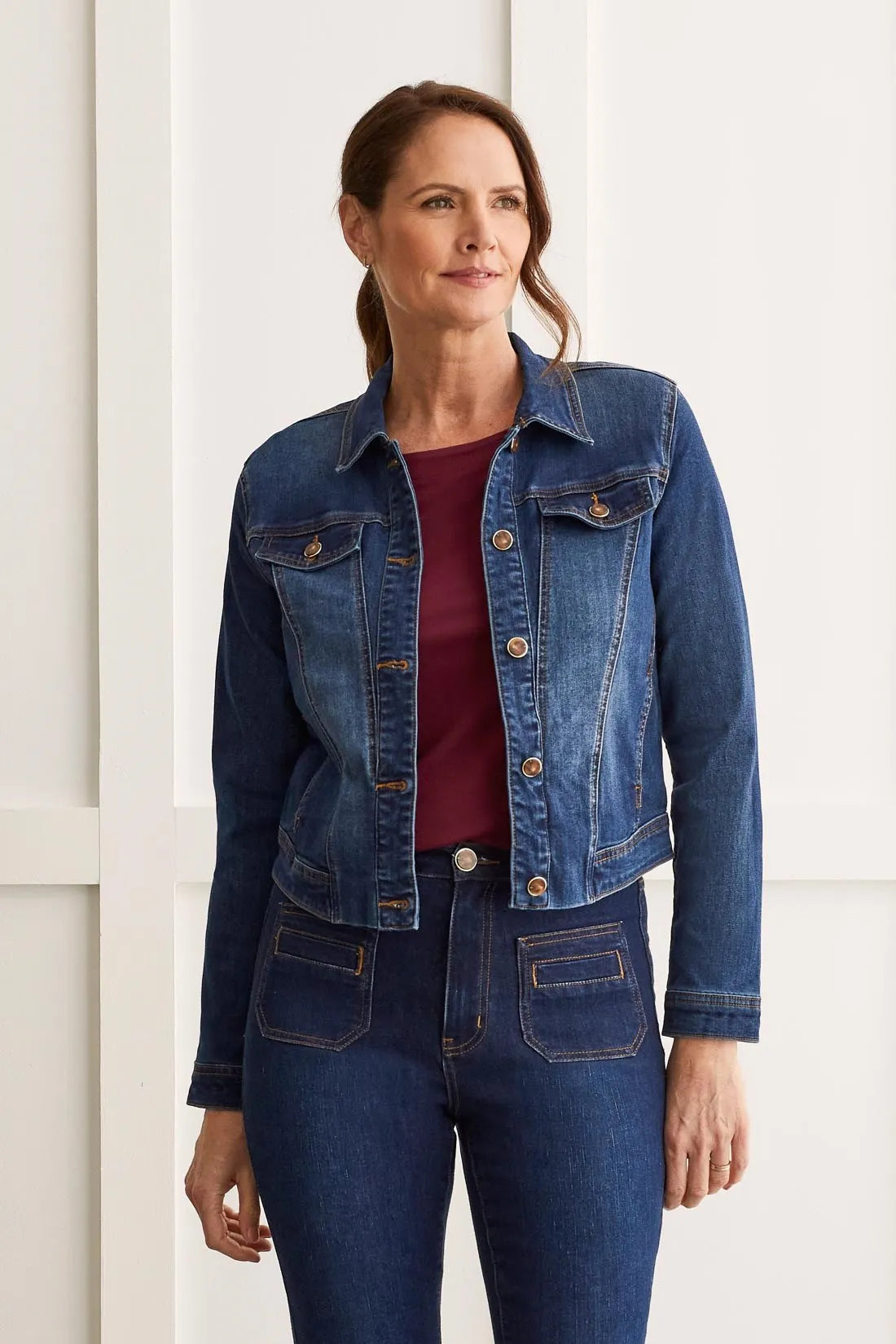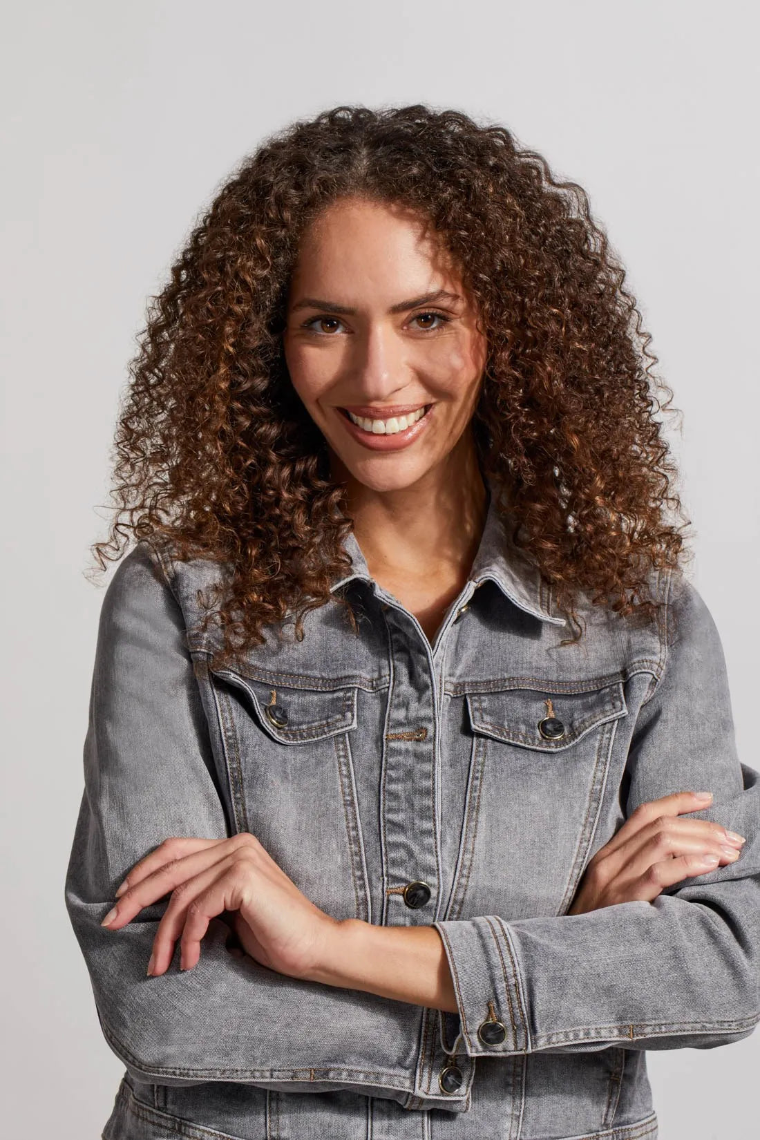 This classically-styled denim jacket features stretch-infused fabric and timeless elements that make it a wardrobe all-star for endless versatility. We're obsessed with the button-up shirt collar neckline, long set-in sleeves with opening cuffs, 22" length, horn buttons, and functional hidden pockets at front seams.