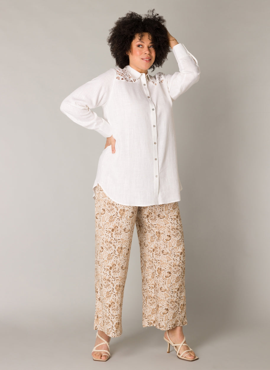 Discover effortless elegance with our off-white long blouse, featuring exquisite openwork lace detailing on the shoulders. Crafted from a premium blend of viscose and linen, this blouse is designed to keep you wonderfully cool and comfortable during the summer months. Its Comfort fit ensures a relaxed yet stylish silhouette, making it a versatile addition to your wardrobe. Whether you're dressing up for a special occasion or opting for a casual day out, this blouse pairs beautifully with everything from tailored trousers to your favorite jeans. Available in timeless off-white, this piece is a must-have for any fashion-forward woman. Elevate your summer style with this chic and breathable blouse.